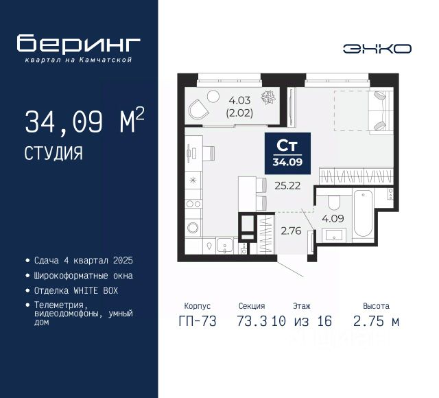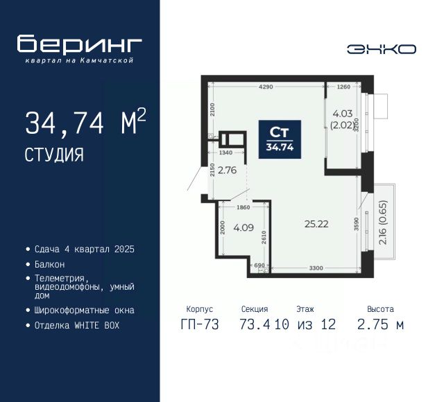 Однокомнатная квартира-студия от застройщика в ЖК "Беринг" на 10 этаже. Квартира без отделки, полностью готова к ремонту. Общая площадь: 37 кв.м., площадь гостиной 26.15 кв.м., из которых 5 кв.м. выделено под кухонную зону. Все окна выходят на одну сторону. В квартире один балкон, один совмещенный санузел. Высота потолков 2.75 м. Дом монолитный, многоподъездный, переменной этажности, от 9 до 21 этажей. Квартира находится в 4-й секции высотой 14 этажей в корпусе ГП-74. На этаже 7 квартир. В подъезде 1 пассажирский и 1 грузовой лифт. Окончание строительства - 4 квартал 2025 года. Оформление сделки по договору долевого участия. Подобно знаменитому исследователю, мы чувствуем себя первооткрывателями этой локации. Хотим показать новую суть места, сформировать для вас жизненный опыт, которого ещё не было. Беринг — район зелёного цвета. Беринг — район, который откроется вам с другой стороны. Впечатлит новым уровнем комфорта и качеством жизни. Беринг — открытие на карте города. Первый квартал расположен в районе Тура, в границах улиц: Камчатская Западносибирская Энтузиастов. Вокруг уже есть всё для того, чтобы ежедневная рутина была лишь частью жизни и не доставляла дискомфорта. Школы и детские сады, магазины и аптеки, поликлиника, места для семейного отдыха, пеших и велопрогулок, и даже рыбалки. Масштабное озеленение дворов — визитная карточка ЭНКО и ваш оазис спокойствия, чтобы отвлечься от повседневности. Раскидистые деревья, кустарники, травы и цветы — осталось остановиться, вдохнуть и расслабиться, глядя на эту природную красоту. Стилистика подъездов продолжает концепцию Беринга, вдохновлённого Камчаткой: сдержанный, но при этом впечатляющий дизайн соседствует с удобством и функциональностью. #zu5sdo