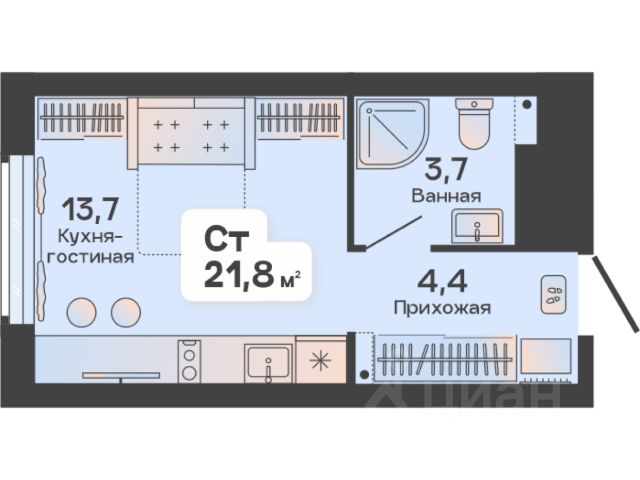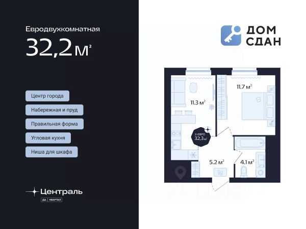 Квартира с кухней-гостиной и одной спальней в кварталах "На Минской". Особенности планировки: вид во двор, предчистовая отделка.