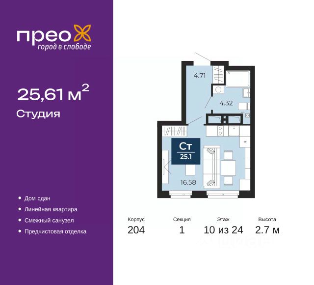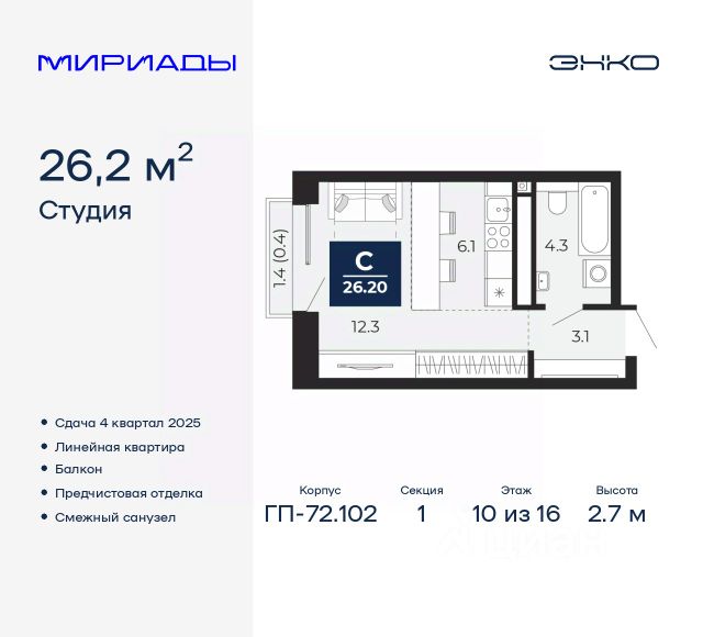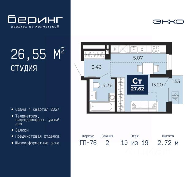1-комн. квартира-студия с предчистовой отделкой в ЖК "Беринг" на 10 этаже. Общая площадь: 34.32 кв.м., площадь гостиной 22.5 кв.м., из которых 5.79 кв.м. выделено под кухонную зону. Все окна выходят на одну сторону. В квартире одна лоджия, один совмещенный санузел. Высота потолков 2.72 м. Дом монолитный, черырехподъездный, переменной этажности, от 19 до 24 этажей. Квартира находится в 1-й секции высотой 23 этажа в корпусе ГП-76. На этаже 7 квартир. В подъезде 2 пассажирских и 1 грузовой лифт. Окончание строительства - 4 квартал 2027 года. Оформление сделки по договору долевого участия. Подобно знаменитому исследователю, мы чувствуем себя первооткрывателями этой локации. Хотим показать новую суть места, сформировать для вас жизненный опыт, которого ещё не было. Беринг — район зелёного цвета. Беринг — район, который откроется вам с другой стороны. Впечатлит новым уровнем комфорта и качеством жизни. Беринг — открытие на карте города. Первый квартал расположен в районе Тура, в границах улиц: Камчатская Западносибирская Энтузиастов. Вокруг уже есть всё для того, чтобы ежедневная рутина была лишь частью жизни и не доставляла дискомфорта. Школы и детские сады, магазины и аптеки, поликлиника, места для семейного отдыха, пеших и велопрогулок, и даже рыбалки. Масштабное озеленение дворов — визитная карточка ЭНКО и ваш оазис спокойствия, чтобы отвлечься от повседневности. Раскидистые деревья, кустарники, травы и цветы — осталось остановиться, вдохнуть и расслабиться, глядя на эту природную красоту. Стилистика подъездов продолжает концепцию Беринга, вдохновлённого Камчаткой: сдержанный, но при этом впечатляющий дизайн соседствует с удобством и функциональностью. #Z66Bel