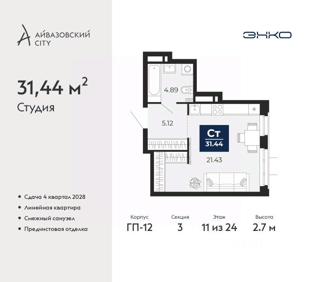 1-комн. квартира-студия от застройщика с предчистовой отделкой в ЖК "Окинава" на 11 этаже. Общая площадь: 28.8 кв.м., площадь гостиной 19.91 кв.м., из которых 5 кв.м. выделено под кухонную зону. Все окна выходят на одну сторону. В квартире одна лоджия, один совмещенный санузел. Высота потолков 2.7 м. Квартира будет сдана с предчистовой отделкой: на полах стяжка под финишное покрытие, стены подготовлены под покраску или оклейку обоями, разведена вся электрика с подготовкой для установки выключателей и освещения. При желании вы можете заказать отделку под ключ, варианты возможных решений представлены в альбоме фотографий. Дом монолитный, многоподъездный, переменной этажности, от 11 до 19 этажей. Квартира находится в 3-й секции высотой 13 этажей в корпусе Дом Воды. На этаже 6 квартир. В подъезде 1 пассажирский и 1 грузовой лифт. Окончание строительства - 4 квартал 2026 года. Оформление сделки по договору долевого участия. ЖК "Окинава" это не просто жилой комплекс, это остров 4 стихий. Они отражаются во внешнем виде фасадов домов, обустройстве дворов и внутреннем оформлении холлов. Каждая из стихий это отдельный дом. Между домами раскинется большой двухуровневый пешеходный бульвар. Первый уровень прогулочный с местами для отдыха, амфитеатром и фонтанами. На втором уровне расположатся площадки для детей, спортивных игр и тренировок. Квартал будет располагать богатой инфраструктурой: на первых этажах разместятся магазины, пекарни, кофейни, пункты выдачи, аптеки, детские центры, цветочные салоны и многое другое, что сделает жизнь поистине комфортной. В жилом комплексе есть кладовые, а также несколько видов паркинга: уличный гостевой, закрытый теплый и паркинг в стилобате, попасть в который можно на лифте с любого жилого этажа. Дворы в каждом доме отражают его стихию, отличаясь по наполнению. Они дополняют друг друга, образуя единое дворовое пространство жилого комплекса. Закрытая территория, свободная от автомобилей, обеспечит безопасность и спокойный отдых. Холлы оформлены керамогранитом, зеркалами и разноуровневым освещением. Витражные входные группы, мягкие зоны ожидания, видеонаблюдение 24/7, вместительные колясочные и даже лапомойки для питомцев всё это будет в ЖК "Окинава". Жилой комплекс "Окинава" находится в активно развивающемся V заречном микрорайоне, недалеко от озера Алебашево, где в будущем расположится масштабный ивент-парк с зонами отдыха. Удобная транспортная развязка позволит добраться до центра всего за 15 минут. #Z4AVt1