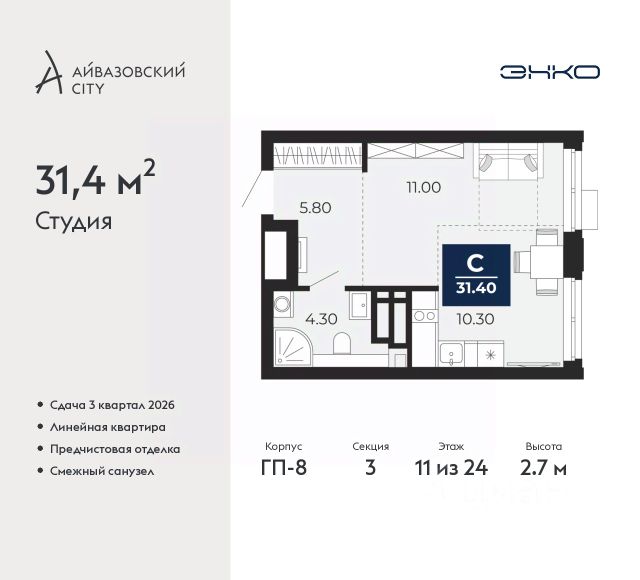 Однокомнатная квартира-студия с предчистовой отделкой в ЖК "Айвазовский City" на 11 этаже. Общая площадь: 31.44 кв.м., площадь гостиной 21.43 кв.м., из которых 5 кв.м. выделено под кухонную зону. Все окна выходят на одну сторону. В квартире один совмещенный санузел. Высота потолков 2.7 м. Дом монолитный, многоподъездный, высотой 24 этажа. Квартира находится в 3-й секции в корпусе ГП-12. На этаже 6 квартир. В подъезде 1 пассажирский и 1 грузовой лифт. Окончание строительства - 4 квартал 2028 года. Оформление сделки по договору долевого участия. Новый жилой район располагается в живописном месте на берегу Туры в центральной части города. Принципиально новое пространство для жизни в центре современного города для тех, чьи мечты сбываются, кто нацелен на постоянный рост, перемены к лучшему для себя и своих близких. Каждая деталь Айвазовский City вдохновляет и заряжает на новые свершения: авторская архитектура, сбалансированная продуманная инфраструктура, дизайнерские дворы со спортивными и детскими площадками, парковые зоны с фонтанами, водный канал, украшающий центральный прогулочный маршрут района и многое другое. В 2019 года проект стал лауреатом престижной премии Urban Awards 2019 в номинации "Лучший строящийся региональный жилой комплекс бизнес-класса". Главная особенность Айвазовский City - соседство разных архитектурных школ в рамках одного дома. Изысканная классика, выразительная эклектика и оригинальный модерн - жить в одном из таких домов настоящий повод для гордости. Айвазовский City это идеальное сочетание комфорта, технологий и развитой инфраструктуры. Вход в подъезд возможен с улицы и со двора. Отправляясь на работу или за покупками, жители могут выйти с внешней стороны дома, а для прогулки с ребенком со стороны двора. Экологически чистые материалы и энергосберегающие технологии, качественное освещение общественных зон, видеонаблюдение по всей территории жилого района (в том числе в подъездах, лифтах и в подземном паркинге), закрытые дворы с доступом только для жителей Айвазовский City. Часть домов в Айвазовский City будут оснащены подземным паркингом. Востребованный в нашем климатическом поясе формат хранения автомобилей защитит собственность владельца в любое время года. Аккредитация в банках: "Сбербанк России", ПАО "Газпромбанк", ПАО Банк "ВТБ", ОАО "Альфа-Банк", ПАО АКБ "Абсолют Банк" и других. #2mvg4g