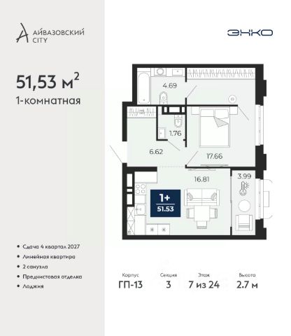 Однокомнатная квартира с предчистовой отделкой в ЖК "Айвазовский City" на 8 этаже. Общая площадь: 42.3 кв.м., жилая: 13.4 кв.м., площадь просторной кухни-столовой: 17.1 кв.м. Все окна выходят на одну сторону. В квартире одна лоджия, один совмещенный санузел. Высота потолков 2.7 м.