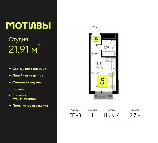 Продаётся квартира площадью 25.3 м2 в жилом комплексе "Айрис". Квартира находится на 11 этаже, жилая площадь квартиры 10.5 м2, площадь кухни-ниши — 5.7 м2 Срок сдачи — III кв. 2027 Жилой комплекс "Айрис" — это: - фиджитал-квартал в Тюмени - дома высотой от 7 до 25 этажей - квартиры с системой "Умный дом" - цифровые технологии как элемент благоустройства Окружение В нескольких минутах ходьбы от дома — парк "Комарово" с волейбольной площадкой, открытым кинотеатром, зонами для барбекю и катком. Неподалеку от Airis находится центр иппотерапии, где можно покататься на лошадях и взять уроки верховой езды. На территории Airis появится собственный парк с прогулочными аллеями. Инфраструктура В 5-10 минутах от квартала открыты 2 детских сада и гимназия. На шопинг можно отправиться в торговые комплексы "Колумб" и "Кристалл" — они находятся недалеко от дома. Благоустройство Уютный двор — приватное пространство для жителей. В беседках можно будет почитать книгу в тишине, а в тени деревьев устроиться на пикник. На крыше многоуровневого паркинга будет лаунж-зона с кинотеатром, баскетбольная площадка и воркаут-пространство, где можно позаниматься с виртуальным тренером — достаточно отсканировать код. Лобби Интерьеры лобби выполнены в пастельных тонах с элементами фиджитал-решений. Для отдыха и ожидания гостей создана лаунж-зона. Также есть гостевые санузлы. Колясочные Возвращайтесь налегке после прогулки с малышом — оставить коляску можно в специальном помещении на первом этаже. Кладовые Для сезонных и габаритных вещей предусмотрены отдельные кладовые на цокольном этаже. В каждом помещении уже проведено электричество и выполнена стяжка пола. Паркинг На территории — два многоуровневых наземных паркинга. Один из них примыкает к домам — из него можно напрямую пройти в парадные. Планировки Планировки квартала — от компактной студии до сити-хауса с собственным палисадником — соответствуют любым жизненным сценариям. Можно выбрать квартиры с террасами и готовыми дизайнерскими интерьерами.