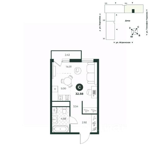Однокомнатная квартира-студия от застройщика с предчистовой отделкой в ЖК "Мириады" на 11 этаже. Общая площадь: 35.54 кв.м., площадь гостиной 24.29 кв.м., из которых 5 кв.м. выделено под кухонную зону. Все окна выходят на одну сторону. В квартире одна лоджия, один совмещенный санузел. Высота потолков 2.7 м. Дом монолитный, черырехподъездный, переменной этажности, от 13 до 16 этажей. Квартира находится во 2-й секции высотой 16 этажей в корпусе ГП-72.106. На этаже 5 квартир. В подъезде 1 пассажирский и 1 грузовой лифт. Окончание строительства - 3 квартал 2028 года. Оформление сделки по договору долевого участия. Вселенная бесконечных историй. Ранее невиданный Тюмени масштаб: территория 240 гектаров и 1 650 000 м² застройки. Мириады это город масштабных перемен и больших возможностей. Город зеленых рощ и зеркальных озер. Город для работы, учебы и развлечений. Город для детей и их родителей. Город для всех и каждого. Проект расположен в районе Мыс рядом с ТРЦ "Тюмень Сити Молл" в границах улицы Тимофея Чаркова, Тобольского тракта и объездной дороги. Срок полного освоения территории - до 2034 года. #ZmDgd2