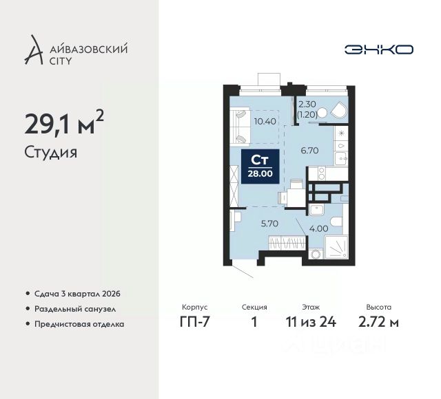1-комн. квартира-студия от застройщика с предчистовой отделкой в ЖК "Окинава" на 11 этаже. Общая площадь: 29.81 кв.м., площадь гостиной 18.08 кв.м., из которых 5 кв.м. выделено под кухонную зону. Все окна выходят на одну сторону. В квартире одна лоджия, один совмещенный санузел. Высота потолков 2.7 м.
