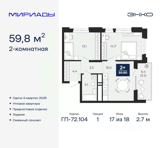 2-комн. квартира с предчистовой отделкой в ЖК "Мириады" на 15 этаже. Общая площадь: 59.8 кв.м., жилая: 27.8 кв.м., площадь просторной кухни-столовой: 16 кв.м. Квартира угловая, окна oбecпeчивaют paвнoмepнoe ocвeщeниe в тeчeниe дня. В квартире одна лоджия, один совмещенный санузел. Высота потолков 2.7 м. Дом монолитный, двухподъездный, переменной этажности, от 14 до 18 этажей. Квартира находится в 1-й секции высотой 18 этажей в корпусе ГП-72.104. На этаже 6 квартир. В подъезде 1 пассажирский и 1 грузовой лифт. Окончание строительства - 4 квартал 2025 года. Оформление сделки по договору долевого участия. Вселенная бесконечных историй. Ранее невиданный Тюмени масштаб: территория 240 гектаров и 1 650 000 м² застройки. Мириады это город масштабных перемен и больших возможностей. Город зеленых рощ и зеркальных озер. Город для работы, учебы и развлечений. Город для детей и их родителей. Город для всех и каждого. Проект расположен в районе Мыс рядом с ТРЦ "Тюмень Сити Молл" в границах улицы Тимофея Чаркова, Тобольского тракта и объездной дороги. Срок полного освоения территории - до 2034 года. #Z67E3v