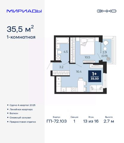 Однокомнатная квартира от застройщика с предчистовой отделкой в ЖК "Мириады" на 13 этаже. Общая площадь: 35.5 кв.м., жилая: 10.5 кв.м., площадь просторной кухни-столовой: 16.4 кв.м. Все окна выходят на одну сторону. В квартире один балкон, один совмещенный санузел. Высота потолков 2.7 м. Дом монолитный, трехподъездный, переменной этажности, от 14 до 16 этажей. Квартира находится в 1-й секции высотой 16 этажей в корпусе ГП-72.103. На этаже 8 квартир. В подъезде 1 пассажирский и 1 грузовой лифт. Окончание строительства - 4 квартал 2025 года. Оформление сделки по договору долевого участия. Вселенная бесконечных историй. Ранее невиданный Тюмени масштаб: территория 240 гектаров и 1 650 000 м² застройки. Мириады это город масштабных перемен и больших возможностей. Город зеленых рощ и зеркальных озер. Город для работы, учебы и развлечений. Город для детей и их родителей. Город для всех и каждого. Проект расположен в районе Мыс рядом с ТРЦ "Тюмень Сити Молл" в границах улицы Тимофея Чаркова, Тобольского тракта и объездной дороги. Срок полного освоения территории - до 2034 года. #2M7DA1