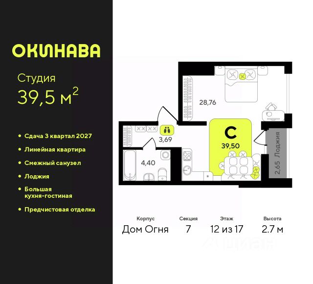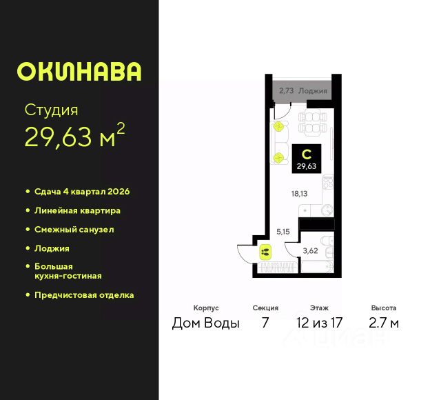 1-комн. квартира-студия от застройщика с предчистовой отделкой в ЖК "Окинава" на 12 этаже. Общая площадь: 24.67 кв.м., площадь гостиной 11.46 кв.м., из которых 5 кв.м. выделено под кухонную зону. Все окна выходят на одну сторону. В квартире одна лоджия, один совмещенный санузел. Высота потолков 2.7 м. Квартира будет сдана с предчистовой отделкой: на полах стяжка под финишное покрытие, стены подготовлены под покраску или оклейку обоями, разведена вся электрика с подготовкой для установки выключателей и освещения. При желании вы можете заказать отделку под ключ, варианты возможных решений представлены в альбоме фотографий. Дом монолитный, многоподъездный, переменной этажности, от 13 до 19 этажей. Квартира находится в 7-й секции высотой 17 этажей в корпусе Дом Огня. На этаже 8 квартир. В подъезде 1 пассажирский и 1 грузовой лифт. Окончание строительства - 3 квартал 2027 года. Оформление сделки по договору долевого участия. ЖК "Окинава" это не просто жилой комплекс, это остров 4 стихий. Они отражаются во внешнем виде фасадов домов, обустройстве дворов и внутреннем оформлении холлов. Каждая из стихий это отдельный дом. Между домами раскинется большой двухуровневый пешеходный бульвар. Первый уровень прогулочный с местами для отдыха, амфитеатром и фонтанами. На втором уровне расположатся площадки для детей, спортивных игр и тренировок. Квартал будет располагать богатой инфраструктурой: на первых этажах разместятся магазины, пекарни, кофейни, пункты выдачи, аптеки, детские центры, цветочные салоны и многое другое, что сделает жизнь поистине комфортной. В жилом комплексе есть кладовые, а также несколько видов паркинга: уличный гостевой, закрытый теплый и паркинг в стилобате, попасть в который можно на лифте с любого жилого этажа. Дворы в каждом доме отражают его стихию, отличаясь по наполнению. Они дополняют друг друга, образуя единое дворовое пространство жилого комплекса. Закрытая территория, свободная от автомобилей, обеспечит безопасность и спокойный отдых. Холлы оформлены керамогранитом, зеркалами и разноуровневым освещением. Витражные входные группы, мягкие зоны ожидания, видеонаблюдение 24/7, вместительные колясочные и даже лапомойки для питомцев всё это будет в ЖК "Окинава". Жилой комплекс "Окинава" находится в активно развивающемся V заречном микрорайоне, недалеко от озера Алебашево, где в будущем расположится масштабный ивент-парк с зонами отдыха. Удобная транспортная развязка позволит добраться до центра всего за 15 минут. #z4ElSo