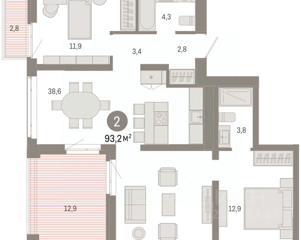 2-комн. квартира с предчистовой отделкой в ЖК "Республики 205" на 7 этаже. Общая площадь: 93.18 кв.м., жилая: 24.8 кв.м., площадь просторной кухни-гостиной: 38.6 кв.м. Угловая квартира, идеально подойдет любителям тишины и панорамных видов. В квартире один балкон и одна лоджия, два совмещенных санузла. Терраса представляет собой роскошную зону отдыха для проведение вечеров в кругу семьи и друзей или организация вечеринок. Высота потолков 2.7 м. Купить квартиру можно с помощью программ покупки от застройщика Брусника: - ипотека по эксклюзивной ставке с помощью в получении положительного кредитного решения через сервис ипотечный брокер; - квартиры в рассрочку без процентов от застройщика Брусника; - обмен квартиры на новую. Получить одобрение ипотеки или рассрочку, а также осуществить обмен квартир можно онлайн. Дом монолитный, многоподъездный, переменной этажности, от 7 до 25 этажей. Квартира находится в 7-й секции высотой 9 этажей в корпусе 3-1. На этаже 7 квартир. В подъезде 1 пассажирский и 1 грузовой лифт. Окончание строительства - 1 квартал 2027 года. Оформление сделки по договору долевого участия. Район Проект расположен в границах улиц Пермякова, Энергетиков, Воровского и Республики. До центра города — 10 минут на машине. Рядом — автомобильная развязка на пересечении улиц Пермякова и Республики. В шаговой доступности есть школы, детские сады, поликлиники, крупный торговый центр, автовокзал и несколько скверов. Проект "Республики 205" — это проект комплексного развития территории, уникальный по своему наполнению. Переосмысляя бывшую территорию завода медицинского оборудования, мы создадим новое место силы — микрорайон, насыщенный деловой, развлекательной, рекреационной, игровой, образовательной и медицинской инфраструктурой. До каждого полезного сервиса здесь можно будет дойти за 15 минут. Локальными центрами "Республики 205" будут общественные пространства — скверы, парки, бульвары и площади. В границах нашего участка мы намерены разместить школу, рассчитанную на 1550 учеников, два детских сада на 300 мест и встроенный детский сад на 100 мест. В одном из цехов бывшего завода расположится креативный кластер "Кузница". Он станет площадкой для нескольких институций — галереи, лектория, книжного магазина-библиотеки, кинобара и точек креативного pop-up-ритейла. Пешеходные бульвары внутри района соединят между собой улицу ресторанов, детские и спортивные площадки, событийную площадь и летний кинотеатр. Идентификатор квартиры по базе застройщика: РСП03. #2MAWSC