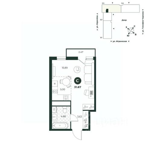Однокомнатная квартира-студия с предчистовой отделкой в ЖК "Айвазовский City" на 2 этаже. Общая площадь: 41.16 кв.м., площадь гостиной 31.52 кв.м., из которых 5 кв.м. выделено под кухонную зону. Угловая квартира, очень светлая, естественная вентиляция при открытии окон. В квартире один совмещенный санузел. Высота потолков 2.7 м. Дом монолитный, многоподъездный, высотой 24 этажа. Квартира находится в 4-й секции в корпусе ГП-13. На этаже 6 квартир. В подъезде 1 пассажирский и 1 грузовой лифт. Окончание строительства - 4 квартал 2027 года. Оформление сделки по договору долевого участия. Новый жилой район располагается в живописном месте на берегу Туры в центральной части города. Принципиально новое пространство для жизни в центре современного города для тех, чьи мечты сбываются, кто нацелен на постоянный рост, перемены к лучшему для себя и своих близких. Каждая деталь Айвазовский City вдохновляет и заряжает на новые свершения: авторская архитектура, сбалансированная продуманная инфраструктура, дизайнерские дворы со спортивными и детскими площадками, парковые зоны с фонтанами, водный канал, украшающий центральный прогулочный маршрут района и многое другое. В 2019 года проект стал лауреатом престижной премии Urban Awards 2019 в номинации "Лучший строящийся региональный жилой комплекс бизнес-класса". Главная особенность Айвазовский City - соседство разных архитектурных школ в рамках одного дома. Изысканная классика, выразительная эклектика и оригинальный модерн - жить в одном из таких домов настоящий повод для гордости. Айвазовский City это идеальное сочетание комфорта, технологий и развитой инфраструктуры. Вход в подъезд возможен с улицы и со двора. Отправляясь на работу или за покупками, жители могут выйти с внешней стороны дома, а для прогулки с ребенком со стороны двора. Экологически чистые материалы и энергосберегающие технологии, качественное освещение общественных зон, видеонаблюдение по всей территории жилого района (в том числе в подъездах, лифтах и в подземном паркинге), закрытые дворы с доступом только для жителей Айвазовский City. Часть домов в Айвазовский City будут оснащены подземным паркингом. Востребованный в нашем климатическом поясе формат хранения автомобилей защитит собственность владельца в любое время года. Аккредитация в банках: "Сбербанк России", ОАО "Альфа-Банк", ПАО Банк "ВТБ", ПАО "Газпромбанк", АО "ДОМ.РФ" и других. #2mvg6V