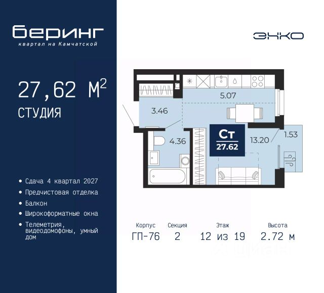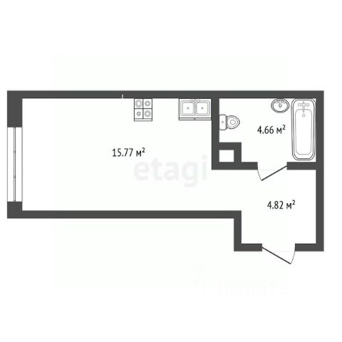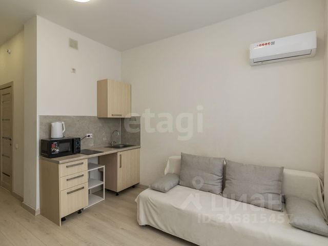 Продается однокомнатная квартира-студия с предчистовой отделкой в ЖК "Мотивы" на 12 этаже. Общая площадь: 24.95 кв.м., площадь гостиной 14.02 кв.м., из которых 5 кв.м. выделено под кухонную зону. Все окна выходят на одну сторону. В квартире один балкон, один совмещенный санузел. Высота потолков 2.7 м.