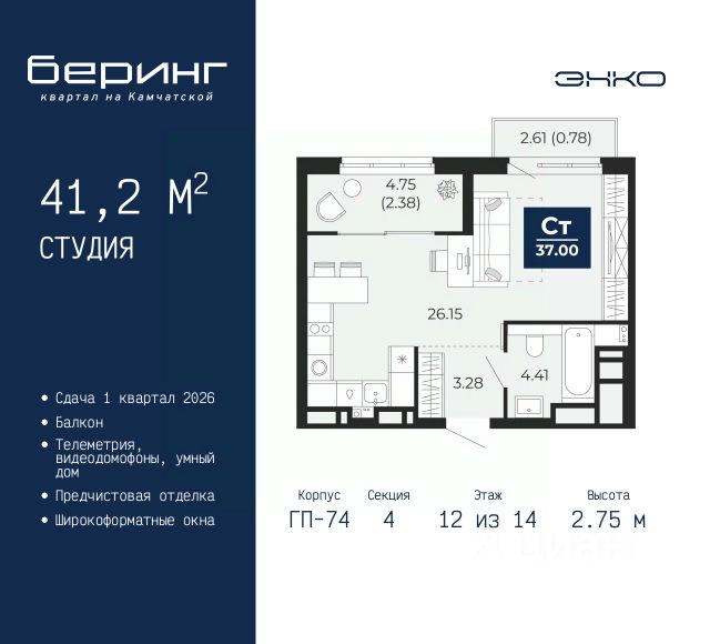 Дом монолитный, черырехподъездный, переменной этажности, от 12 до 14 этажей. Квартира находится в 6-й секции высотой 14 этажей в корпусе ГП-8. На этаже 12 квартир. В подъезде 1 пассажирский и 1 грузовой лифт. Окончание строительства - 2 квартал 2026 года. Оформление сделки по договору долевого участия.