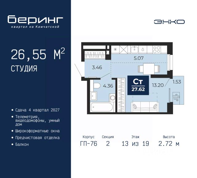 Однокомнатная квартира-студия от застройщика с предчистовой отделкой в ЖК "Беринг" на 13 этаже. Общая площадь: 34.32 кв.м., площадь гостиной 22.5 кв.м., из которых 5.79 кв.м. выделено под кухонную зону. Все окна выходят на одну сторону. В квартире одна лоджия, один совмещенный санузел. Высота потолков 2.72 м. Дом монолитный, черырехподъездный, переменной этажности, от 19 до 24 этажей. Квартира находится в 1-й секции высотой 23 этажа в корпусе ГП-76. На этаже 7 квартир. В подъезде 2 пассажирских и 1 грузовой лифт. Окончание строительства - 4 квартал 2027 года. Оформление сделки по договору долевого участия. Подобно знаменитому исследователю, мы чувствуем себя первооткрывателями этой локации. Хотим показать новую суть места, сформировать для вас жизненный опыт, которого ещё не было. Беринг — район зелёного цвета. Беринг — район, который откроется вам с другой стороны. Впечатлит новым уровнем комфорта и качеством жизни. Беринг — открытие на карте города. Первый квартал расположен в районе Тура, в границах улиц: Камчатская Западносибирская Энтузиастов. Вокруг уже есть всё для того, чтобы ежедневная рутина была лишь частью жизни и не доставляла дискомфорта. Школы и детские сады, магазины и аптеки, поликлиника, места для семейного отдыха, пеших и велопрогулок, и даже рыбалки. Масштабное озеленение дворов — визитная карточка ЭНКО и ваш оазис спокойствия, чтобы отвлечься от повседневности. Раскидистые деревья, кустарники, травы и цветы — осталось остановиться, вдохнуть и расслабиться, глядя на эту природную красоту. Стилистика подъездов продолжает концепцию Беринга, вдохновлённого Камчаткой: сдержанный, но при этом впечатляющий дизайн соседствует с удобством и функциональностью. #Z66bFb