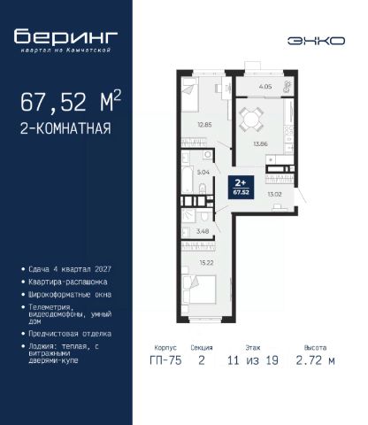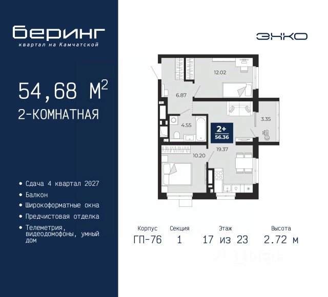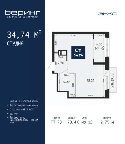 Продается 1-комн. квартира-студия с предчистовой отделкой в ЖК "Беринг" на 13 этаже. Общая площадь: 26.55 кв.м., площадь гостиной 18.27 кв.м., из которых 5.07 кв.м. выделено под кухонную зону. Все окна выходят на одну сторону. В квартире один балкон, один совмещенный санузел. Высота потолков 2.72 м. Дом монолитный, черырехподъездный, переменной этажности, от 19 до 24 этажей. Квартира находится во 2-й секции высотой 19 этажей в корпусе ГП-76. На этаже 8 квартир. В подъезде 1 пассажирский и 1 грузовой лифт. Окончание строительства - 4 квартал 2027 года. Оформление сделки по договору долевого участия. Подобно знаменитому исследователю, мы чувствуем себя первооткрывателями этой локации. Хотим показать новую суть места, сформировать для вас жизненный опыт, которого ещё не было. Беринг — район зелёного цвета. Беринг — район, который откроется вам с другой стороны. Впечатлит новым уровнем комфорта и качеством жизни. Беринг — открытие на карте города. Первый квартал расположен в районе Тура, в границах улиц: Камчатская Западносибирская Энтузиастов. Вокруг уже есть всё для того, чтобы ежедневная рутина была лишь частью жизни и не доставляла дискомфорта. Школы и детские сады, магазины и аптеки, поликлиника, места для семейного отдыха, пеших и велопрогулок, и даже рыбалки. Масштабное озеленение дворов — визитная карточка ЭНКО и ваш оазис спокойствия, чтобы отвлечься от повседневности. Раскидистые деревья, кустарники, травы и цветы — осталось остановиться, вдохнуть и расслабиться, глядя на эту природную красоту. Стилистика подъездов продолжает концепцию Беринга, вдохновлённого Камчаткой: сдержанный, но при этом впечатляющий дизайн соседствует с удобством и функциональностью. #zMmC79