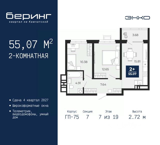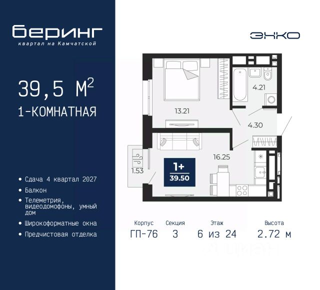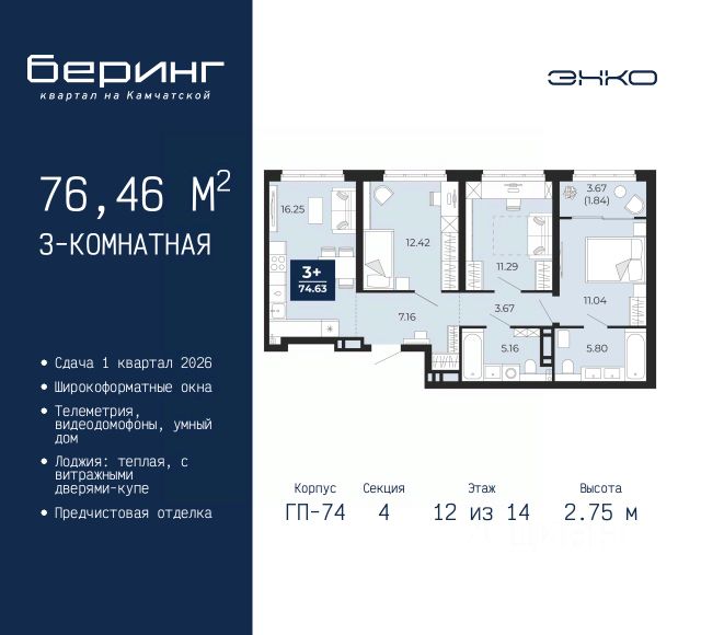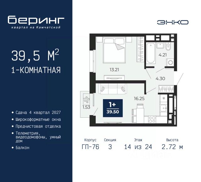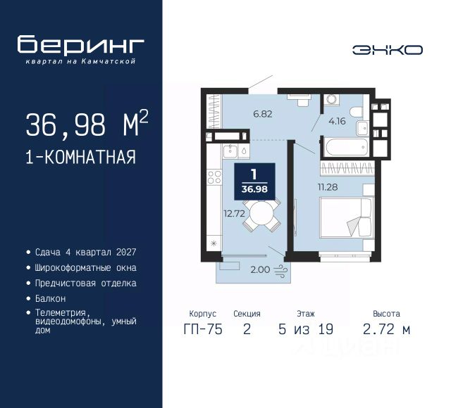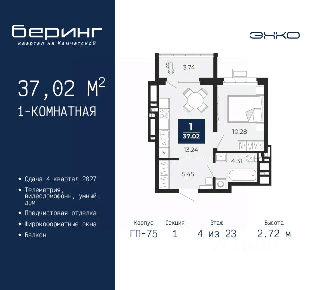 1-комн. квартира-студия с предчистовой отделкой в ЖК "Беринг" на 13 этаже. Общая площадь: 34.32 кв.м., площадь гостиной 22.5 кв.м., из которых 5.79 кв.м. выделено под кухонную зону. Все окна выходят на одну сторону. В квартире одна лоджия, один совмещенный санузел. Высота потолков 2.72 м. Дом монолитный, черырехподъездный, переменной этажности, от 19 до 24 этажей. Квартира находится в 1-й секции высотой 23 этажа в корпусе ГП-76. На этаже 7 квартир. В подъезде 2 пассажирских и 1 грузовой лифт. Окончание строительства - 4 квартал 2027 года. Оформление сделки по договору долевого участия. Подобно знаменитому исследователю, мы чувствуем себя первооткрывателями этой локации. Хотим показать новую суть места, сформировать для вас жизненный опыт, которого ещё не было. Беринг — район зелёного цвета. Беринг — район, который откроется вам с другой стороны. Впечатлит новым уровнем комфорта и качеством жизни. Беринг — открытие на карте города. Первый квартал расположен в районе Тура, в границах улиц: Камчатская Западносибирская Энтузиастов. Вокруг уже есть всё для того, чтобы ежедневная рутина была лишь частью жизни и не доставляла дискомфорта. Школы и детские сады, магазины и аптеки, поликлиника, места для семейного отдыха, пеших и велопрогулок, и даже рыбалки. Масштабное озеленение дворов — визитная карточка ЭНКО и ваш оазис спокойствия, чтобы отвлечься от повседневности. Раскидистые деревья, кустарники, травы и цветы — осталось остановиться, вдохнуть и расслабиться, глядя на эту природную красоту. Стилистика подъездов продолжает концепцию Беринга, вдохновлённого Камчаткой: сдержанный, но при этом впечатляющий дизайн соседствует с удобством и функциональностью. #ZMmBFB