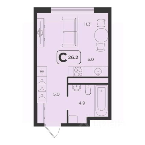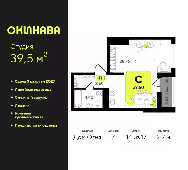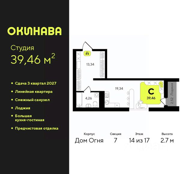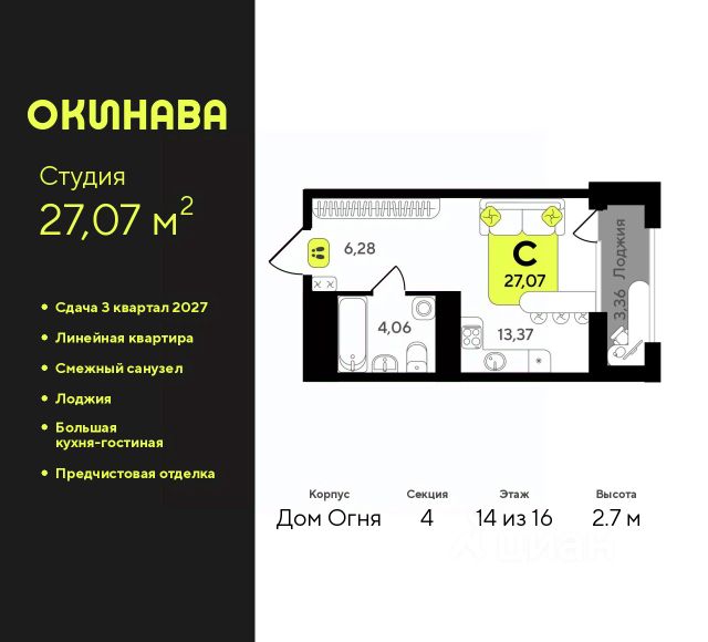 1-комн. квартира-студия с предчистовой отделкой в ЖК "Окинава" на 14 этаже. Общая площадь: 27.07 кв.м., площадь гостиной 13.37 кв.м., из которых 5 кв.м. выделено под кухонную зону. Все окна выходят на одну сторону. В квартире одна лоджия, один совмещенный санузел. Высота потолков 2.7 м.