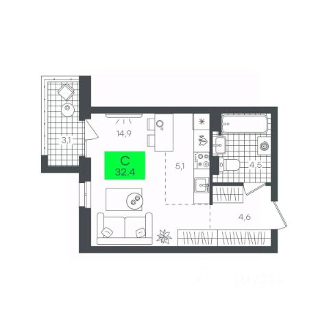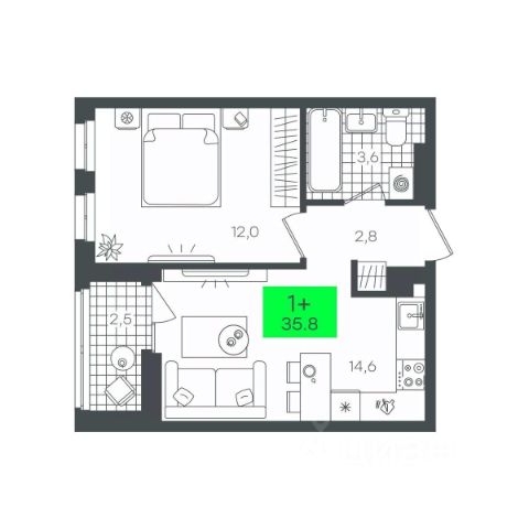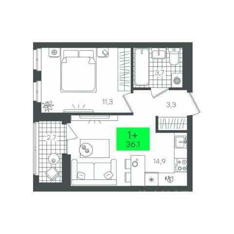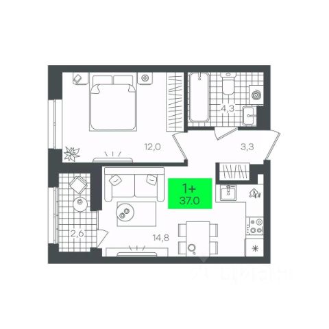 1-комн. квартира от застройщика с предчистовой отделкой в ЖК "Прео" на 9 этаже. Общая площадь: 39.05 кв.м. Высота потолков 2.7 м.
