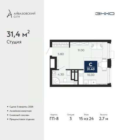 Спешите оформить бронирование на этих условиях, период предложения ограничен! Стоимость квартиры указана со скидкой, ваша экономия составит 500,000 руб. По всем вопросам звоните в офис продаж, мы вам все подробно расскажем. 1-комн. квартира-студия с предчистовой отделкой в ЖК "Айвазовский" на 15 этаже. Общая площадь: 28 кв.м., площадь гостиной 17.1 кв.м., из которых 6.7 кв.м. выделено под кухонную зону. Все окна выходят на одну сторону. В квартире одна лоджия, один совмещенный санузел. Высота потолков 2.72 м. Дом монолитный, многоподъездный, переменной этажности, от 9 до 24 этажей. Квартира находится в 1-й секции высотой 24 этажа в корпусе ГП-7. На этаже 6 квартир. В подъезде 1 пассажирский и 2 грузовых лифта. Окончание строительства - 3 квартал 2026 года. Оформление сделки по договору долевого участия. Новый жилой район располагается в живописном месте на берегу Туры в центральной части города. Принципиально новое пространство для жизни в центре современного города для тех, чьи мечты сбываются, кто нацелен на постоянный рост, перемены к лучшему для себя и своих близких. Каждая деталь ЖК "Айвазовский" вдохновляет и заряжает на новые свершения: авторская архитектура, сбалансированная продуманная инфраструктура, дизайнерские дворы со спортивными и детскими площадками, парковые зоны с фонтанами, водный канал, украшающий центральный прогулочный маршрут района и многое другое. В 2019 года проект стал лауреатом престижной премии Urban Awards 2019 в номинации "Лучший строящийся региональный жилой комплекс бизнес-класса". Главная особенность Айвазовский - соседство разных архитектурных школ в рамках одного дома. Изысканная классика, выразительная эклектика и оригинальный модерн - жить в одном из таких домов настоящий повод для гордости. Айвазовский это идеальное сочетание комфорта, технологий и развитой инфраструктуры. Вход в подъезд возможен с улицы и со двора. Отправляясь на работу или за покупками, жители могут выйти с внешней стороны дома, а для прогулки с ребенком со стороны двора. Экологически чистые материалы и энергосберегающие технологии, качественное освещение общественных зон, видеонаблюдение по всей территории жилого района (в том числе в подъездах, лифтах и в подземном паркинге), закрытые дворы с доступом только для жителей Айвазовский. Часть домов в Айвазовский будут оснащены подземным паркингом. Востребованный в нашем климатическом поясе формат хранения автомобилей защитит собственность владельца в любое время года. Аккредитация в банках: ПАО Банк "ВТБ", ПАО "Газпромбанк", "Сбербанк России", ОАО "Альфа-Банк", ПАО "Промсвязьбанк" и других. #z6dfWo