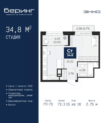Продается 1-комн. квартира-студия с предчистовой отделкой в ЖК "Беринг" на 15 этаже. Общая площадь: 34.8 кв.м., площадь гостиной 25.22 кв.м., из которых 5 кв.м. выделено под кухонную зону. Все окна выходят на одну сторону. В квартире один балкон, один совмещенный санузел. Высота потолков 2.75 м. Дом монолитный, многоподъездный, переменной этажности, от 9 до 22 этажей. Квартира находится в 73.3-й секции высотой 16 этажей в корпусе ГП-73. На этаже 8 квартир. В подъезде 1 пассажирский и 1 грузовой лифт. Окончание строительства - 1 квартал 2026 года. Оформление сделки по договору долевого участия. Подобно знаменитому исследователю, мы чувствуем себя первооткрывателями этой локации. Хотим показать новую суть места, сформировать для вас жизненный опыт, которого ещё не было. Беринг — район зелёного цвета. Беринг — район, который откроется вам с другой стороны. Впечатлит новым уровнем комфорта и качеством жизни. Беринг — открытие на карте города. Первый квартал расположен в районе Тура, в границах улиц: Камчатская Западносибирская Энтузиастов. Вокруг уже есть всё для того, чтобы ежедневная рутина была лишь частью жизни и не доставляла дискомфорта. Школы и детские сады, магазины и аптеки, поликлиника, места для семейного отдыха, пеших и велопрогулок, и даже рыбалки. Масштабное озеленение дворов — визитная карточка ЭНКО и ваш оазис спокойствия, чтобы отвлечься от повседневности. Раскидистые деревья, кустарники, травы и цветы — осталось остановиться, вдохнуть и расслабиться, глядя на эту природную красоту. Стилистика подъездов продолжает концепцию Беринга, вдохновлённого Камчаткой: сдержанный, но при этом впечатляющий дизайн соседствует с удобством и функциональностью. #2uSs2d