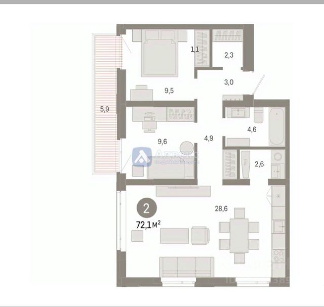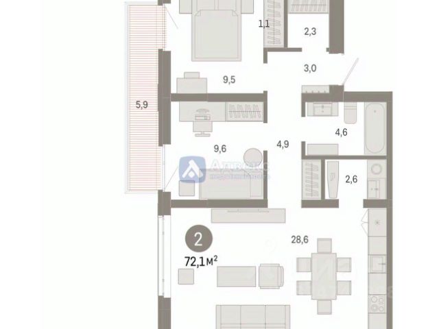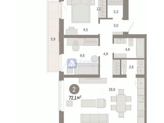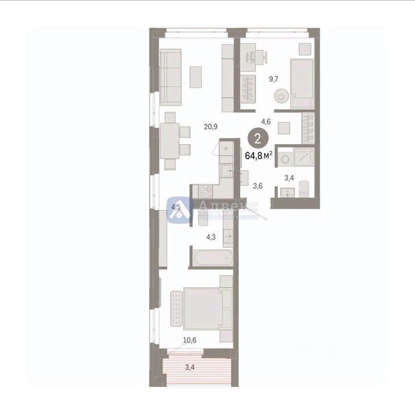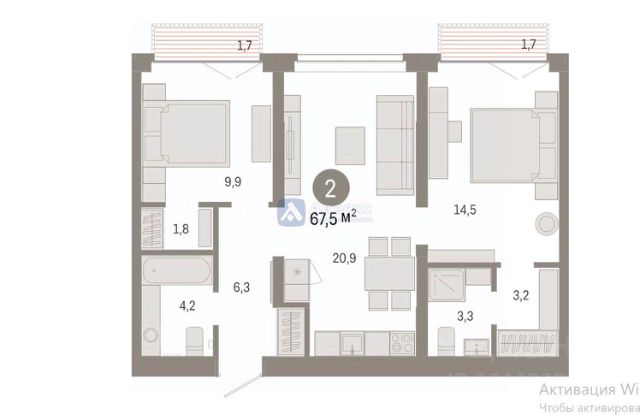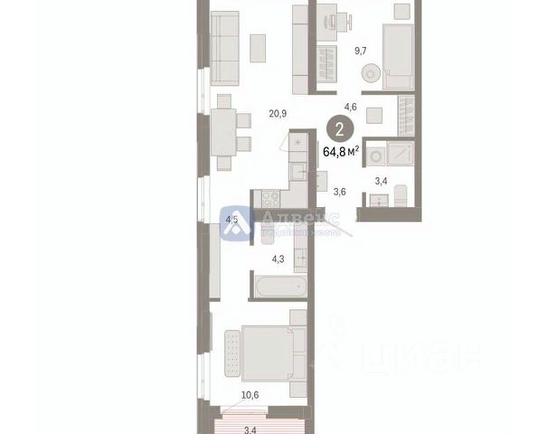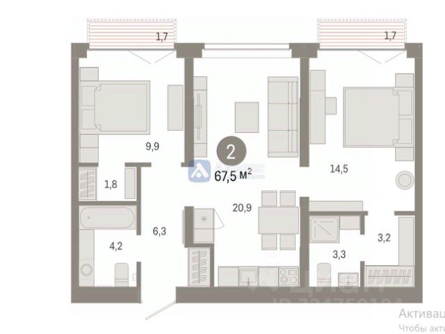 Просторная 2-комн. квартира с предчистовой отделкой в ЖК "Республики 205" на 5 этаже. Общая площадь: 67.52 кв.м., жилая: 24.4 кв.м., площадь просторной кухни-гостиной: 20.9 кв.м. Комнаты изолированные, все окна выходят на одну сторону. В квартире два балкона, два совмещенных санузла. Высота потолков 2.7 м.