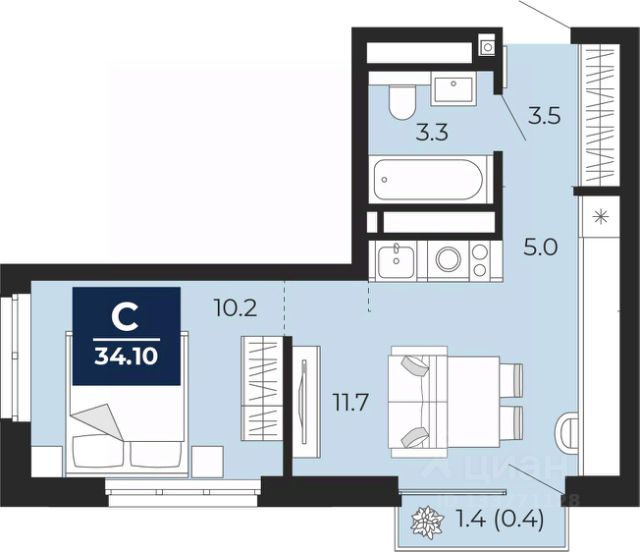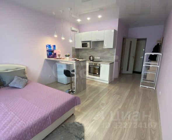 Однокомнатная квартира-студия с предчистовой отделкой в ЖК "Айвазовский City" на 15 этаже. Общая площадь: 31.4 кв.м., площадь гостиной 21.3 кв.м., из которых 10.3 кв.м. выделено под кухонную зону. Все окна выходят на одну сторону. В квартире один совмещенный санузел. Высота потолков 2.7 м.