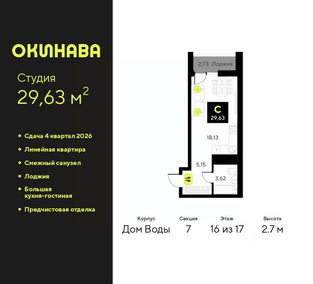 Продается однокомнатная студия от застройщика с предчистовой отделкой в ЖК "Зарека" на 16 этаже. Общая площадь: 23.14 кв.м. Высота потолков 2.7 м. Дом монолитный, многоподъездный, переменной этажности, от 6 до 16 этажей. Квартира находится в 1-й секции высотой 16 этажей в корпусе 5-2. На этаже 8 квартир. В подъезде 1 пассажирский и 1 грузовой лифт. Окончание строительства - 4 квартал 2026 года. Оформление сделки по договору долевого участия. Продаётся с паркингом и кладовой. Студия в жилом районе "Зарека". Особенности планировки: лоджия, предчистовая отделка. квартиры в нашей базе: ЗРК05.2-Ж1.16.3. Проект На планировочную структуру "Зареки" повлияла близость к автомобильному мосту Челюскинцев. Мы расположили жилые здания так, чтобы они постепенно удалялись от проезжей части. Приём напоминает лесенку: чем сильнее мост возвышается над участком застройки, тем дальше по отношению к нему стоят дома. Этот ступенчатый сдвиг позволил нам сформировать буфер между кварталами и оживлённой магистралью. Мы намерены высадить здесь высокие деревья и создать дополнительную защиту от дорожных шума и пыли. В границах нашего участка мы намерены разместить школу и два встроенных детских сада на 135 и 150 мест. Общественные пространства С севера на юг территорию будет пронизывать пешеходный бульвар. Мы мыслим это общественное пространство как главный центр притяжения. На нём будут сосредоточены основные детские игровые и спортивные зоны, места для встреч и спокойного отдыха. Он также сыграет роль мостика, ведущего к другим нашим проектам — "Европейскому кварталу" и "Дому у озера". Одна из базовых идей мастер-плана касается береговой линии. Сегодня озеленение этой территории носит стихииныи характер, а прямому доступу к Туре препятствует дамба. Мы хотим благоустроить пространства у воды и открыть их для людей. Архитекторы спроектировали систему многоярусных троп и спусков к реке, смотровые площадки и места для активного отдыха и пикников. #26goZo