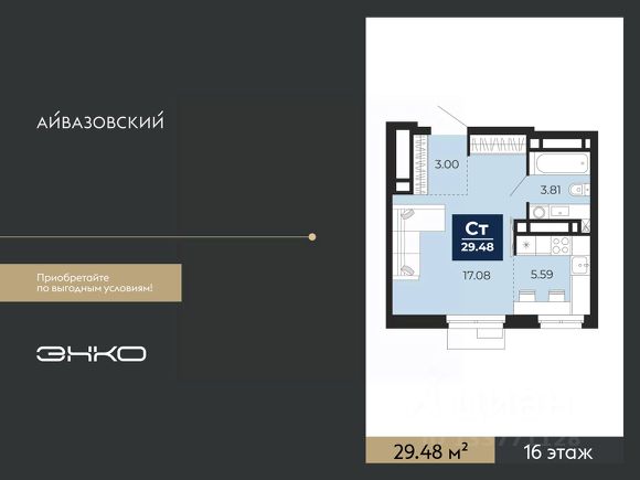 Однокомнатная квартира-студия с предчистовой отделкой в ЖК "Айвазовский" на 16 этаже. Общая площадь: 29.48 кв.м., площадь гостиной 22.67 кв.м., из которых 5.59 кв.м. выделено под кухонную зону. Все окна выходят на одну сторону. В квартире один совмещенный санузел. Высота потолков 2.7 м. Дом монолитный, многоподъездный, высотой 24 этажа. Квартира находится во 2-й секции в корпусе ГП-13. На этаже 6 квартир. В подъезде 1 пассажирский и 1 грузовой лифт. Окончание строительства - 4 квартал 2027 года. Оформление сделки по договору долевого участия. Новый жилой район располагается в живописном месте на берегу Туры в центральной части города. Принципиально новое пространство для жизни в центре современного города для тех, чьи мечты сбываются, кто нацелен на постоянный рост, перемены к лучшему для себя и своих близких. Каждая деталь ЖК "Айвазовский" вдохновляет и заряжает на новые свершения: авторская архитектура, сбалансированная продуманная инфраструктура, дизайнерские дворы со спортивными и детскими площадками, парковые зоны с фонтанами, водный канал, украшающий центральный прогулочный маршрут района и многое другое. В 2019 года проект стал лауреатом престижной премии Urban Awards 2019 в номинации "Лучший строящийся региональный жилой комплекс бизнес-класса". Главная особенность Айвазовский - соседство разных архитектурных школ в рамках одного дома. Изысканная классика, выразительная эклектика и оригинальный модерн - жить в одном из таких домов настоящий повод для гордости. Айвазовский это идеальное сочетание комфорта, технологий и развитой инфраструктуры. Вход в подъезд возможен с улицы и со двора. Отправляясь на работу или за покупками, жители могут выйти с внешней стороны дома, а для прогулки с ребенком со стороны двора. Экологически чистые материалы и энергосберегающие технологии, качественное освещение общественных зон, видеонаблюдение по всей территории жилого района (в том числе в подъездах, лифтах и в подземном паркинге), закрытые дворы с доступом только для жителей Айвазовский. Часть домов в Айвазовский будут оснащены подземным паркингом. Востребованный в нашем климатическом поясе формат хранения автомобилей защитит собственность владельца в любое время года. Аккредитация в банках: ПАО Банк "ВТБ", ОАО "Альфа-Банк", ПАО "Газпромбанк", "Сбербанк России", ПАО "Промсвязьбанк" и других. #zT0dVv