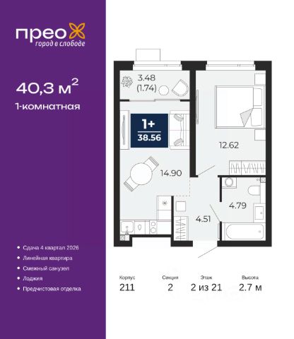 Дом монолитный, трехподъездный, переменной этажности, от 14 до 23 этажей. Квартира находится в 1-й секции высотой 23 этажа в корпусе 206. На этаже 8 квартир. В подъезде 1 пассажирский и 1 грузовой лифт. Окончание строительства - 1 квартал 2026 года. Оформление сделки по договору долевого участия.