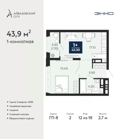 Спешите забронировать по этой цене, период акции ограничен! Стоимость квартиры указана со скидкой, ваша экономия составит 500,000 руб. По всем вопросам звоните в офис продаж, мы вам все подробно расскажем. 1-комн. квартира от застройщика с предчистовой отделкой в ЖК "Айвазовский" на 12 этаже. Общая площадь: 43.9 кв.м., жилая: 13.4 кв.м., площадь просторной кухни-столовой: 17.1 кв.м. Все окна выходят на одну сторону. В квартире одна лоджия, один совмещенный санузел. Высота потолков 2.7 м. Дом монолитный, многоподъездный, переменной этажности, от 14 до 24 этажей. Квартира находится во 2-й секции высотой 18 этажей в корпусе ГП-8. На этаже 5 квартир. В подъезде 1 пассажирский и 1 грузовой лифт. Окончание строительства - 3 квартал 2026 года. Оформление сделки по договору долевого участия. Новый жилой район располагается в живописном месте на берегу Туры в центральной части города. Принципиально новое пространство для жизни в центре современного города для тех, чьи мечты сбываются, кто нацелен на постоянный рост, перемены к лучшему для себя и своих близких. Каждая деталь ЖК "Айвазовский" вдохновляет и заряжает на новые свершения: авторская архитектура, сбалансированная продуманная инфраструктура, дизайнерские дворы со спортивными и детскими площадками, парковые зоны с фонтанами, водный канал, украшающий центральный прогулочный маршрут района и многое другое. В 2019 года проект стал лауреатом престижной премии Urban Awards 2019 в номинации "Лучший строящийся региональный жилой комплекс бизнес-класса". Главная особенность Айвазовский - соседство разных архитектурных школ в рамках одного дома. Изысканная классика, выразительная эклектика и оригинальный модерн - жить в одном из таких домов настоящий повод для гордости. Айвазовский это идеальное сочетание комфорта, технологий и развитой инфраструктуры. Вход в подъезд возможен с улицы и со двора. Отправляясь на работу или за покупками, жители могут выйти с внешней стороны дома, а для прогулки с ребенком со стороны двора. Экологически чистые материалы и энергосберегающие технологии, качественное освещение общественных зон, видеонаблюдение по всей территории жилого района (в том числе в подъездах, лифтах и в подземном паркинге), закрытые дворы с доступом только для жителей Айвазовский. Часть домов в Айвазовский будут оснащены подземным паркингом. Востребованный в нашем климатическом поясе формат хранения автомобилей защитит собственность владельца в любое время года. Аккредитация в банках: ПАО Банк "ВТБ", "Сбербанк России", ПАО "Газпромбанк", ОАО "Альфа-Банк", ПАО "Промсвязьбанк" и других. #zMeoa8
