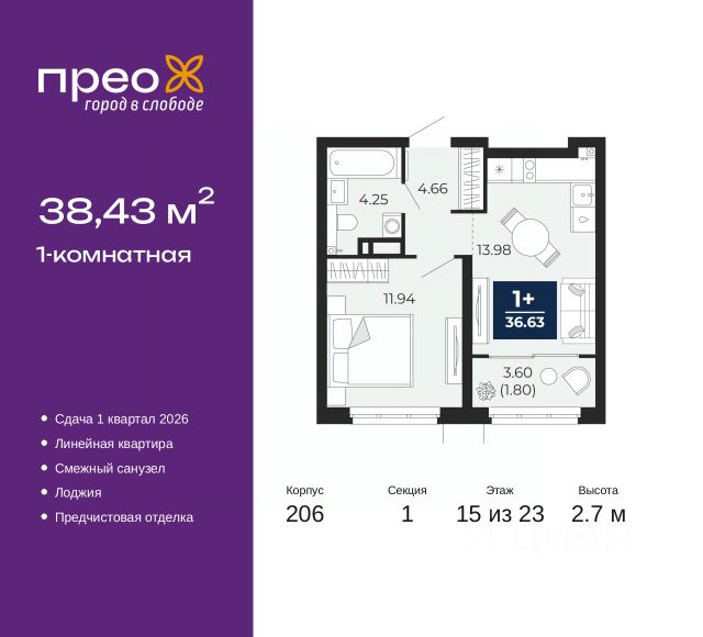 Успейте забронировать, пока действует скидка, предложение ограничено! Стоимость квартиры указана со скидкой, ваша экономия составит 345,634 руб. По всем вопросам обращайтесь в офис продаж, мы вам все подробно расскажем. Просторная 1-комн. квартира с предчистовой отделкой в ЖК "Прео" на 15 этаже. Общая площадь: 38.43 кв.м., жилая: 11.94 кв.м., площадь просторной кухни-столовой: 13.98 кв.м. Все окна выходят на одну сторону. В квартире одна лоджия, один совмещенный санузел. Высота потолков 2.7 м. Дом монолитный, трехподъездный, переменной этажности, от 14 до 23 этажей. Квартира находится в 1-й секции высотой 23 этажа в корпусе 206. На этаже 8 квартир. В подъезде 1 пассажирский и 1 грузовой лифт. Окончание строительства - 1 квартал 2026 года. Оформление сделки по договору долевого участия. Преображенский — один из самых привлекательных районов для жизни! Это полностью самостоятельный жилой район с точки зрения инфраструктуры. Преображенский находится между Московским и Червишевским трактами в квартале улиц Закалужская — Вьюжная — Александра Протозанова. Не нужно ждать, когда появится инфраструктура — переезжайте на всё готовое. Вблизи расположены действующие школа и детский сад. В этом году откроется еще один сад, а в следующем году — школа. По соседству с Преображенским запланировано строительство городского парка "Комарово" площадью 38 гектар. За 10 минут можно доехать на автомобиле до крупных ТРЦ: "Лента", "Кристалл", "Леруа Мерлен", "Метро" и "Ашан". С 2018 года в районе открыт Соседский центр — пространство, созданное для формирования добрососедской среды, совместного досуга, общения и реализации соседских инициатив. Здесь проходят встречи соседей, а также сами жители района организовывают мероприятия. Организатором такого события может стать любой желающий. В квартирах выполнена качественная предчистовая отделка. Гладкие стены с финишным выравниванием по маякам. Ровный потолок для установки натяжного потолка. Установлены пятикамерные окна с двойным стеклопакетом (3 стекла). Дизайнерские холлы с видеонаблюдением, безбарьерным и прозрачным входом всегда светло и спокойно. На первом этаже есть просторные колясочные, где все жители могут оставлять свои коляски и велосипеды. В Преображенском есть всё, что нужно для активного отдыха и занятий спортом. Мы сделали большое футбольное поле с безопасным покрытием. Также установили хоккейный корт, который оборудован по всем необходимым стандартам. Во дворах можно делать упражнения на специальных площадках с турниками. Весь район мы обустроили велодорожками, которые связаны в единый маршрут. У нас есть сухие фонтаны, бьющие из земли, деревья, веревки, сетки, скалодром, газон, песок и резинка — осталось просто дать своему ребенку право на свободную игру. По-настоящему хорошие дворы — это те, которые дети предпочитают соцсетям и телевизору. Аккредитация в банках: "Сбербанк России", ПАО "Газпромбанк", ПАО "Банк Уралсиб", ОАО "Альфа-Банк", ПАО Банк "ВТБ" и других. #zTobAe