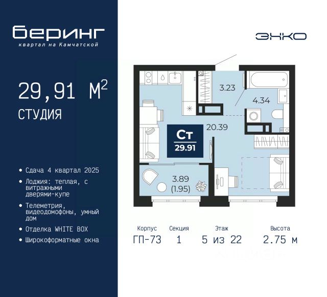 Продается 1-комн. квартира-студия с предчистовой отделкой в ЖК "Беринг" на 5 этаже. Общая площадь: 34.32 кв.м., площадь гостиной 22.5 кв.м., из которых 5.79 кв.м. выделено под кухонную зону. Все окна выходят на одну сторону. В квартире одна лоджия, один совмещенный санузел. Высота потолков 2.72 м. Дом монолитный, черырехподъездный, переменной этажности, от 19 до 24 этажей. Квартира находится в 1-й секции высотой 23 этажа в корпусе ГП-76. На этаже 7 квартир. В подъезде 2 пассажирских и 1 грузовой лифт. Окончание строительства - 4 квартал 2027 года. Оформление сделки по договору долевого участия. Подобно знаменитому исследователю, мы чувствуем себя первооткрывателями этой локации. Хотим показать новую суть места, сформировать для вас жизненный опыт, которого ещё не было. Беринг — район зелёного цвета. Беринг — район, который откроется вам с другой стороны. Впечатлит новым уровнем комфорта и качеством жизни. Беринг — открытие на карте города. Первый квартал расположен в районе Тура, в границах улиц: Камчатская Западносибирская Энтузиастов. Вокруг уже есть всё для того, чтобы ежедневная рутина была лишь частью жизни и не доставляла дискомфорта. Школы и детские сады, магазины и аптеки, поликлиника, места для семейного отдыха, пеших и велопрогулок, и даже рыбалки. Масштабное озеленение дворов — визитная карточка ЭНКО и ваш оазис спокойствия, чтобы отвлечься от повседневности. Раскидистые деревья, кустарники, травы и цветы — осталось остановиться, вдохнуть и расслабиться, глядя на эту природную красоту. Стилистика подъездов продолжает концепцию Беринга, вдохновлённого Камчаткой: сдержанный, но при этом впечатляющий дизайн соседствует с удобством и функциональностью. #26Mbb2