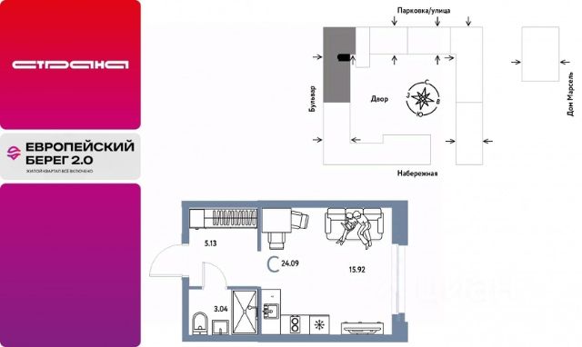 Объявление от застройщика Страна Девелопмент. Покупка квартиры защищена банком. Продается 1комнатная квартира на 5 этаже от застройщика Страна Девелопмент. Площадь квартиры 20,84 кв. м. Стоимость указана без учета акций. Европейский берег 2.0. — это продолжение легендарного жилого комплекса Европейский берег. Он включает все, что нужно для жизни, и даже больше. Этот квартал для тех, кто не готов тратить время на ненужное, жертвовать одним ради другого. Для тех, кто хочет получить все и сразу. Именно поэтому генеральная идея проекта — жилой квартал все включено. Все преимущества включены. Никаких исключений. ПРЕИМУЩЕСТВА Разнообразие планировок: от классических до квартир с мастер-спальней и террасами. Подземный паркинг с кладовыми, охраной и видеонаблюдением 24/7. Ремонт от застройщика: 5 вариантов на выбор. Закрытый двор с площадками и зонами отдыха: мост-акведук, тренажёры, лабиринты, гамаки и шезлонги. ОТДЕЛКА Базовая отделка или готовый ремонт от застройщика. В базовой отделке все черновые работы выполнены, подведены коммуникации, стены оштукатурены под маяк. В ремонт от застройщика входит 5 вариантов отделки, уже включено всё необходимое: от сантехники до кондиционера. СПОСОБЫ ПОКУПКИ Сотрудники "Страны Девелопмент" будут сопровождать вас на каждом этапе сделки, помогут получить одобрение по ипотеке или снизить ежемесячный платеж. - ипотека - материнский капитал - 100% оплата наличными - рассрочка - обмен — это выкуп вашей старой квартиры и зачисление полученных денежных средств в счет стоимости новой квартиры или в качестве первоначального взноса по ипотеке.