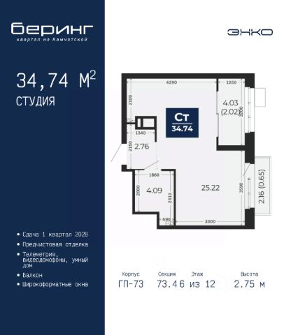 Просторная 1-комн. квартира-студия с предчистовой отделкой в ЖК "Беринг" на 6 этаже. Общая площадь: 31.43 кв.м., площадь гостиной 20.33 кв.м., из которых 9.75 кв.м. выделено под кухонную зону. Все окна выходят на одну сторону. В квартире один балкон, один совмещенный санузел. Высота потолков 2.72 м. Дом монолитный, многоподъездный, переменной этажности, от 17 до 24 этажей. Квартира находится в 8-й секции высотой 17 этажей в корпусе ГП-75. На этаже 8 квартир. В подъезде 2 пассажирских и 1 грузовой лифт. Окончание строительства - 4 квартал 2027 года. Оформление сделки по договору долевого участия. Подобно знаменитому исследователю, мы чувствуем себя первооткрывателями этой локации. Хотим показать новую суть места, сформировать для вас жизненный опыт, которого ещё не было. Беринг — район зелёного цвета. Беринг — район, который откроется вам с другой стороны. Впечатлит новым уровнем комфорта и качеством жизни. Беринг — открытие на карте города. Первый квартал расположен в районе Тура, в границах улиц: Камчатская Западносибирская Энтузиастов. Вокруг уже есть всё для того, чтобы ежедневная рутина была лишь частью жизни и не доставляла дискомфорта. Школы и детские сады, магазины и аптеки, поликлиника, места для семейного отдыха, пеших и велопрогулок, и даже рыбалки. Масштабное озеленение дворов — визитная карточка ЭНКО и ваш оазис спокойствия, чтобы отвлечься от повседневности. Раскидистые деревья, кустарники, травы и цветы — осталось остановиться, вдохнуть и расслабиться, глядя на эту природную красоту. Стилистика подъездов продолжает концепцию Беринга, вдохновлённого Камчаткой: сдержанный, но при этом впечатляющий дизайн соседствует с удобством и функциональностью. #zmg903