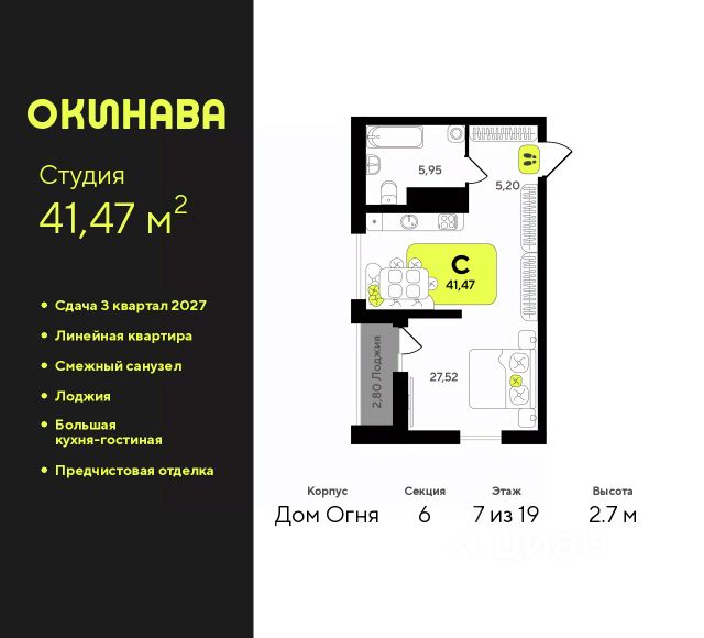 1-комн. квартира-студия с предчистовой отделкой в ЖК "Айвазовский City" на 7 этаже. Общая площадь: 28 кв.м., площадь гостиной 17.1 кв.м., из которых 6.7 кв.м. выделено под кухонную зону. Все окна выходят на одну сторону. В квартире одна лоджия, один совмещенный санузел. Высота потолков 2.72 м. Дом монолитный, многоподъездный, переменной этажности, от 9 до 24 этажей. Квартира находится во 2-й секции высотой 24 этажа в корпусе ГП-7. На этаже 7 квартир. В подъезде 1 пассажирский и 2 грузовых лифта. Окончание строительства - 3 квартал 2026 года. Оформление сделки по договору долевого участия. Новый жилой район располагается в живописном месте на берегу Туры в центральной части города. Принципиально новое пространство для жизни в центре современного города для тех, чьи мечты сбываются, кто нацелен на постоянный рост, перемены к лучшему для себя и своих близких. Каждая деталь Айвазовский City вдохновляет и заряжает на новые свершения: авторская архитектура, сбалансированная продуманная инфраструктура, дизайнерские дворы со спортивными и детскими площадками, парковые зоны с фонтанами, водный канал, украшающий центральный прогулочный маршрут района и многое другое. В 2019 года проект стал лауреатом престижной премии Urban Awards 2019 в номинации "Лучший строящийся региональный жилой комплекс бизнес-класса". Главная особенность Айвазовский City - соседство разных архитектурных школ в рамках одного дома. Изысканная классика, выразительная эклектика и оригинальный модерн - жить в одном из таких домов настоящий повод для гордости. Айвазовский City это идеальное сочетание комфорта, технологий и развитой инфраструктуры. Вход в подъезд возможен с улицы и со двора. Отправляясь на работу или за покупками, жители могут выйти с внешней стороны дома, а для прогулки с ребенком со стороны двора. Экологически чистые материалы и энергосберегающие технологии, качественное освещение общественных зон, видеонаблюдение по всей территории жилого района (в том числе в подъездах, лифтах и в подземном паркинге), закрытые дворы с доступом только для жителей Айвазовский City. Часть домов в Айвазовский City будут оснащены подземным паркингом. Востребованный в нашем климатическом поясе формат хранения автомобилей защитит собственность владельца в любое время года. Аккредитация в банках: "Сбербанк России", ПАО "Газпромбанк", ОАО "Альфа-Банк", ПАО Банк "ВТБ", ПАО АКБ "Абсолют Банк" и других. #2sFMT3