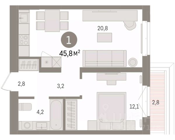 Однокомнатная квартира с предчистовой отделкой в ЖК "Республики 205" на 1 этаже. Общая площадь: 75.55 кв.м., жилая: 12.7 кв.м., площадь просторной кухни-гостиной: 29.8 кв.м. Все окна выходят на одну сторону. В квартире один балкон, один совмещенный санузел. Наличие в квартире террасы размером 17.1 кв.м. открывает возможность для обустройства дополнительной площади. Высота потолков 2.6 м.