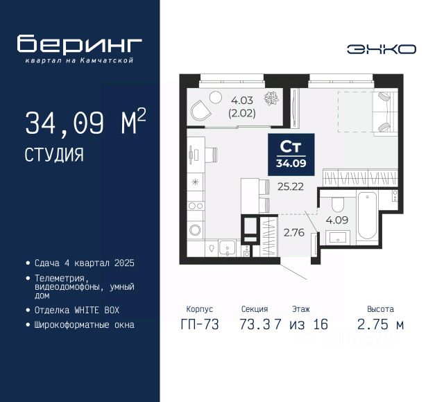 Продается 1-комн. квартира-студия от застройщика с предчистовой отделкой в ЖК "Прео" на 7 этаже. Общая площадь: 34.51 кв.м., площадь гостиной 23.87 кв.м., из которых 10 кв.м. выделено под кухонную зону. Все окна выходят на одну сторону. В квартире один балкон, один совмещенный санузел. Высота потолков 2.7 м.