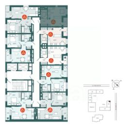 Планировка точная и разумная — как хороший мотив: просторная кухнягостиная 19,7 м², где удобно собирать гостей и одновременно готовить, две правильной формы комнаты 12,3 и 11,3 м² — одна из них легко становится мастерспальней, другая — детской или камерным кабинетом. Два санузла (приблизительно 3,8 и 3,5 м²) — редкая приятность в городской квартире; лоджия/балкон 3,9 м² даёт дополнительную интимную террасунишу для растений и утра с чашкой кофе. Прихожие и ниши продуманы для хранения — место для аккуратного гардероба и техники, ничего не мешает глазу и движению. Планировка по сути — "игра на контрастах": простор для общения и уют для уединения, всё по правилам современной жизни.