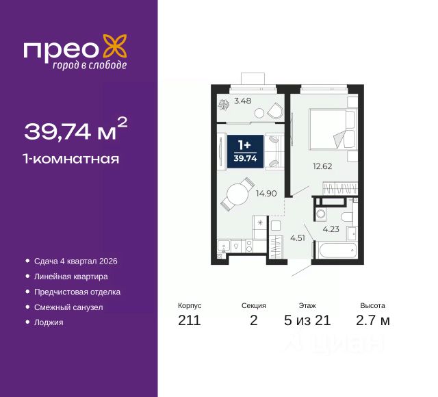 Успейте оформить бронирование на этих условиях, срок предложения ограничен! Стоимость квартиры указана со скидкой, ваша экономия составит 335,585 руб. Звоните, наши менеджеры вам все расскажут. 1-комн. квартира с предчистовой отделкой в ЖК "Прео" на 7 этаже. Общая площадь: 39.74 кв.м., жилая: 12.62 кв.м., площадь просторной кухни-столовой: 14.9 кв.м. Все окна выходят на одну сторону. В квартире одна лоджия, один совмещенный санузел. Высота потолков 2.7 м. Дом монолитный, трехподъездный, переменной этажности, от 14 до 23 этажей. Квартира находится во 2-й секции высотой 23 этажа в корпусе 206. На этаже 10 квартир. В подъезде 1 пассажирский и 1 грузовой лифт. Окончание строительства - 1 квартал 2026 года. Оформление сделки по договору долевого участия. Преображенский — один из самых привлекательных районов для жизни! Это полностью самостоятельный жилой район с точки зрения инфраструктуры. Преображенский находится между Московским и Червишевским трактами в квартале улиц Закалужская — Вьюжная — Александра Протозанова. Не нужно ждать, когда появится инфраструктура — переезжайте на всё готовое. Вблизи расположены действующие школа и детский сад. В этом году откроется еще один сад, а в следующем году — школа. По соседству с Преображенским запланировано строительство городского парка "Комарово" площадью 38 гектар. За 10 минут можно доехать на автомобиле до крупных ТРЦ: "Лента", "Кристалл", "Леруа Мерлен", "Метро" и "Ашан". С 2018 года в районе открыт Соседский центр — пространство, созданное для формирования добрососедской среды, совместного досуга, общения и реализации соседских инициатив. Здесь проходят встречи соседей, а также сами жители района организовывают мероприятия. Организатором такого события может стать любой желающий. В квартирах выполнена качественная предчистовая отделка. Гладкие стены с финишным выравниванием по маякам. Ровный потолок для установки натяжного потолка. Установлены пятикамерные окна с двойным стеклопакетом (3 стекла). Дизайнерские холлы с видеонаблюдением, безбарьерным и прозрачным входом всегда светло и спокойно. На первом этаже есть просторные колясочные, где все жители могут оставлять свои коляски и велосипеды. В Преображенском есть всё, что нужно для активного отдыха и занятий спортом. Мы сделали большое футбольное поле с безопасным покрытием. Также установили хоккейный корт, который оборудован по всем необходимым стандартам. Во дворах можно делать упражнения на специальных площадках с турниками. Весь район мы обустроили велодорожками, которые связаны в единый маршрут. У нас есть сухие фонтаны, бьющие из земли, деревья, веревки, сетки, скалодром, газон, песок и резинка — осталось просто дать своему ребенку право на свободную игру. По-настоящему хорошие дворы — это те, которые дети предпочитают соцсетям и телевизору. Аккредитация в банках: ПАО Банк "ВТБ", "Сбербанк России", ОАО "Альфа-Банк", ПАО "Банк Уралсиб", ПАО "Газпромбанк" и других. #27ObAd