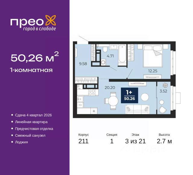 Спешите забронировать по акционной цене, предложение ограничено! Стоимость квартиры указана со скидкой, ваша экономия составит 1,101,000 руб. Звоните, мы вам все подробно расскажем. 1-комн. квартира с предчистовой отделкой в ЖК "Прео" на 13 этаже. Общая площадь: 50.26 кв.м., жилая: 12.25 кв.м., площадь просторной кухни-столовой: 20.2 кв.м. Все окна выходят на одну сторону. В квартире одна лоджия, один совмещенный санузел. Высота потолков 2.7 м. Дом монолитный, черырехподъездный, переменной этажности, от 14 до 21 этажей. Квартира находится в 1-й секции высотой 21 этаж в корпусе 211. На этаже 8 квартир. В подъезде 1 пассажирский и 1 грузовой лифт. Окончание строительства - 4 квартал 2026 года. Оформление сделки по договору долевого участия. Преображенский — один из самых привлекательных районов для жизни! Это полностью самостоятельный жилой район с точки зрения инфраструктуры. Преображенский находится между Московским и Червишевским трактами в квартале улиц Закалужская — Вьюжная — Александра Протозанова. Не нужно ждать, когда появится инфраструктура — переезжайте на всё готовое. Вблизи расположены действующие школа и детский сад. В этом году откроется еще один сад, а в следующем году — школа. По соседству с Преображенским запланировано строительство городского парка "Комарово" площадью 38 гектар. За 10 минут можно доехать на автомобиле до крупных ТРЦ: "Лента", "Кристалл", "Леруа Мерлен", "Метро" и "Ашан". С 2018 года в районе открыт Соседский центр — пространство, созданное для формирования добрососедской среды, совместного досуга, общения и реализации соседских инициатив. Здесь проходят встречи соседей, а также сами жители района организовывают мероприятия. Организатором такого события может стать любой желающий. В квартирах выполнена качественная предчистовая отделка. Гладкие стены с финишным выравниванием по маякам. Ровный потолок для установки натяжного потолка. Установлены пятикамерные окна с двойным стеклопакетом (3 стекла). Дизайнерские холлы с видеонаблюдением, безбарьерным и прозрачным входом всегда светло и спокойно. На первом этаже есть просторные колясочные, где все жители могут оставлять свои коляски и велосипеды. В Преображенском есть всё, что нужно для активного отдыха и занятий спортом. Мы сделали большое футбольное поле с безопасным покрытием. Также установили хоккейный корт, который оборудован по всем необходимым стандартам. Во дворах можно делать упражнения на специальных площадках с турниками. Весь район мы обустроили велодорожками, которые связаны в единый маршрут. У нас есть сухие фонтаны, бьющие из земли, деревья, веревки, сетки, скалодром, газон, песок и резинка — осталось просто дать своему ребенку право на свободную игру. По-настоящему хорошие дворы — это те, которые дети предпочитают соцсетям и телевизору. Аккредитация в банках: "Сбербанк России", ПАО "Банк Уралсиб", ПАО "Газпромбанк", ПАО Банк "ВТБ", ОАО "Альфа-Банк" и других. #zT0bbV