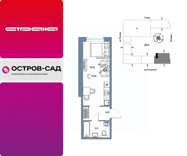 Новая квартира в ЖК "Остров-сад" напрямую от федеральной группы компаний "Страна Девелопмент". Финансовый партнер — Сбербанк России. Продается 1комнатная квартира на 9 этаже от застройщика Страна Девелопмент. Площадь квартиры 20,93 кв. м. ЖК "ОСТРОВ-САД" Жилой комплекс ЖК "Остров-сад" — новый квартал в районе ДОК в Тюмени недалеко от центра. Внутри ЖК планируется несколько школ и детсадов, торговая галерея, своя набережная, закрытые дворы-сады, несколько подземных и многоуровневых паркингов и пешеходный бульвар. Архитектура комплекса отсылает к истории ДОКа — отделка из красного кирпича, акцентные цвета штукатурки и необычная ступенчатая форма зданий. Всё для комфортной жизни на своём "острове" рядом с центром Тюмени. ПРЕИМУЩЕСТВА Квартиры с готовым ремонтом, возможность приобрести квартиру с кухонным гарнитуром и техникой. Развитое жилое пространство — закрытые дворы-сады, свои набережная и бульвар, торговая галерея на 1-м этаже, рядом детсады, школы и поликлиника. Служба охраны и видеонаблюдение в доме и во дворе 24/7. Несколько многоуровневых и подземных паркингов с охраной. ОТДЕЛКА Необходимые работы уже выполнены: подведены холодная, горячая вода и электричество, установлены батареи. В квартире не проводились отделочные работы: не выровнены стены и пол. ДИЗАЙНЕРСКАЯ ОТДЕЛКА В ЖК "Остров-сад" есть квартиры с готовым ремонтом. Пять вариантов на выбор в разных цветовых решениях. В ремонт также включены светильники, межкомнатные двери и даже кондиционер. Можно выбрать отдельно ремонт в ванной, для вас 4 стильных варианта с сантехникой. СПОСОБЫ ПОКУПКИ Сотрудники "Страна Девелопмент" будут сопровождать вас на каждом этапе сделки, помогут получить одобрение по ипотеке или снизить ежемесячный платеж. - ипотека - материнский капитал - 100% оплата наличными