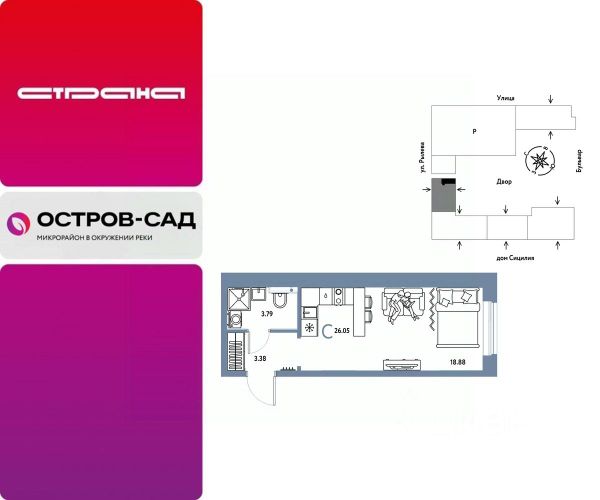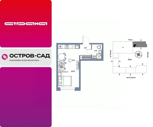 Новая квартира в ЖК "Остров-сад" напрямую от федеральной группы компаний "Страна Девелопмент". Финансовый партнер — Сбербанк России. Продается 1комнатная квартира на 9 этаже от застройщика Страна Девелопмент. Площадь квартиры 26,67 кв. м. ЖК "ОСТРОВ-САД" Жилой комплекс ЖК "Остров-сад" — новый квартал в районе ДОК в Тюмени недалеко от центра. Внутри ЖК планируется несколько школ и детсадов, торговая галерея, своя набережная, закрытые дворы-сады, несколько подземных и многоуровневых паркингов и пешеходный бульвар. Архитектура комплекса отсылает к истории ДОКа — отделка из красного кирпича, акцентные цвета штукатурки и необычная ступенчатая форма зданий. Всё для комфортной жизни на своём "острове" рядом с центром Тюмени. ПРЕИМУЩЕСТВА Квартиры с готовым ремонтом, возможность приобрести квартиру с кухонным гарнитуром и техникой. Развитое жилое пространство — закрытые дворы-сады, свои набережная и бульвар, торговая галерея на 1-м этаже, рядом детсады, школы и поликлиника. Служба охраны и видеонаблюдение в доме и во дворе 24/7. Несколько многоуровневых и подземных паркингов с охраной. ОТДЕЛКА Необходимые работы уже выполнены: подведены холодная, горячая вода и электричество, установлены батареи. В квартире не проводились отделочные работы: не выровнены стены и пол. ДИЗАЙНЕРСКАЯ ОТДЕЛКА В ЖК "Остров-сад" есть квартиры с готовым ремонтом. Пять вариантов на выбор в разных цветовых решениях. В ремонт также включены светильники, межкомнатные двери и даже кондиционер. Можно выбрать отдельно ремонт в ванной, для вас 4 стильных варианта с сантехникой. СПОСОБЫ ПОКУПКИ Сотрудники "Страна Девелопмент" будут сопровождать вас на каждом этапе сделки, помогут получить одобрение по ипотеке или снизить ежемесячный платеж. - ипотека - материнский капитал - 100% оплата наличными