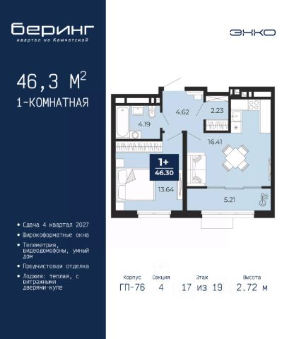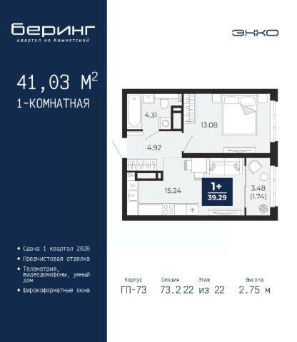 Продается 1-комн. квартира-студия с предчистовой отделкой в ЖК "Беринг" на 9 этаже. Общая площадь: 27.62 кв.м., площадь гостиной 18.9 кв.м., из которых 5.7 кв.м. выделено под кухонную зону. Все окна выходят на одну сторону. В квартире один балкон, один совмещенный санузел. Высота потолков 2.72 м. Дом монолитный, черырехподъездный, переменной этажности, от 19 до 24 этажей. Квартира находится во 2-й секции высотой 19 этажей в корпусе ГП-76. На этаже 8 квартир. В подъезде 1 пассажирский и 1 грузовой лифт. Окончание строительства - 4 квартал 2027 года. Оформление сделки по договору долевого участия. Подобно знаменитому исследователю, мы чувствуем себя первооткрывателями этой локации. Хотим показать новую суть места, сформировать для вас жизненный опыт, которого ещё не было. Беринг — район зелёного цвета. Беринг — район, который откроется вам с другой стороны. Впечатлит новым уровнем комфорта и качеством жизни. Беринг — открытие на карте города. Первый квартал расположен в районе Тура, в границах улиц: Камчатская Западносибирская Энтузиастов. Вокруг уже есть всё для того, чтобы ежедневная рутина была лишь частью жизни и не доставляла дискомфорта. Школы и детские сады, магазины и аптеки, поликлиника, места для семейного отдыха, пеших и велопрогулок, и даже рыбалки. Масштабное озеленение дворов — визитная карточка ЭНКО и ваш оазис спокойствия, чтобы отвлечься от повседневности. Раскидистые деревья, кустарники, травы и цветы — осталось остановиться, вдохнуть и расслабиться, глядя на эту природную красоту. Стилистика подъездов продолжает концепцию Беринга, вдохновлённого Камчаткой: сдержанный, но при этом впечатляющий дизайн соседствует с удобством и функциональностью. #Z6DDUZ