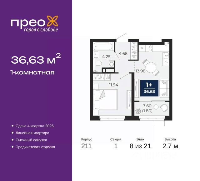 Дом монолитный, черырехподъездный, переменной этажности, от 14 до 21 этажей. Квартира находится в 3-й секции высотой 14 этажей в корпусе 211. На этаже 6 квартир. В подъезде 1 пассажирский и 1 грузовой лифт. Окончание строительства - 4 квартал 2026 года. Оформление сделки по договору долевого участия.
