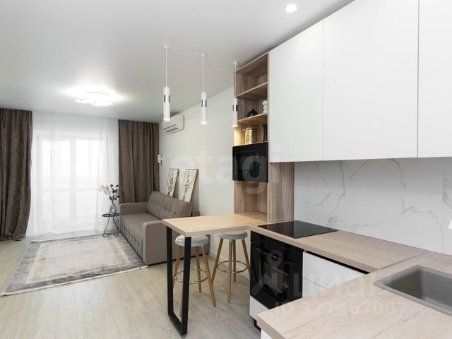 СРОЧНАЯ ПРОДАЖА! Студия с современным ремонтом в жилом комплексе "Кристалл" — это готовое решение для комфортной жизни или выгодного вложения. Квартира полностью укомплектована мебелью и техникой: кухонный гарнитур, холодильник, посудомоечная и стиральная машины, кондиционер — все остается новому владельцу. На кухне установлена вытяжка, при желании можно установить варочную панель. В настоящее время на кухне переносная индукционная. При входе стоит вместительный шкаф для гардероба и встроенные шкафы для хранения мелочевки ( глубина 15см). Отделка выполнена в нейтральных тонах с качественными материалами, что позволяет заселиться сразу после покупки. Теплые полы в санузле, радиатор, большое место для хранения, встроенный тропический душ все новое и выполнено из качественных материалов. Планировка продумана до мелочей: компактная кухонная зона совмещена с гостиной, а спальное место органично вписывается в пространство без ущерба для функциональности.