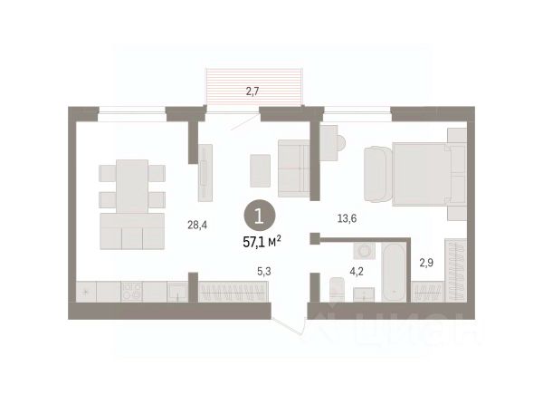 Квартира с кухней-гостиной и двумя спальнями в кварталах "На Минской". Особенности планировки: балкон, предчистовая отделка, разнесённые спальни, тёплая лоджия.