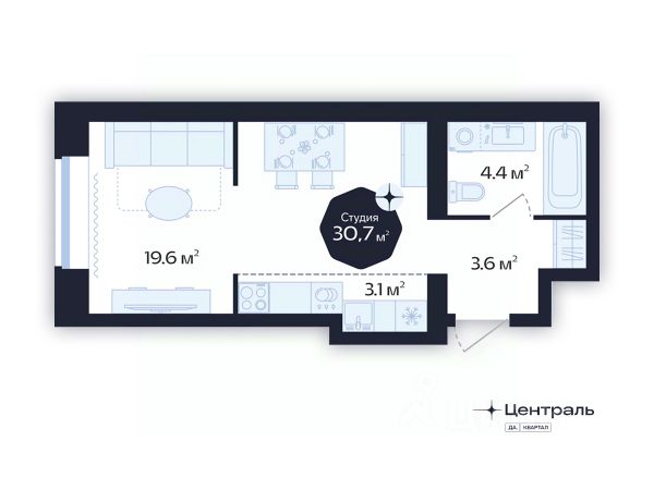 Квартира с кухней-гостиной и одной спальней в Доме у озера. Особенности планировки: вид во двор, панорамное остекление, предчистовая отделка, балкон.