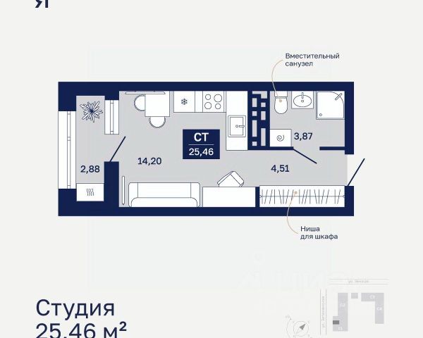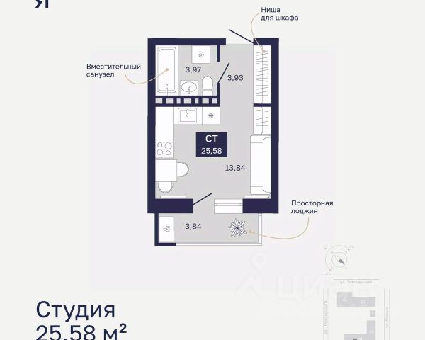 Продаётся квартира площадью 25.3 м2 в жилом комплексе "Айрис". Квартира находится на 19 этаже, жилая площадь квартиры 10.5 м2, площадь кухни-ниши — 5.7 м2 Срок сдачи — III кв. 2027 Жилой комплекс "Айрис" — это: - фиджитал-квартал в Тюмени - дома высотой от 7 до 25 этажей - квартиры с системой "Умный дом" - цифровые технологии как элемент благоустройства Окружение В нескольких минутах ходьбы от дома — парк "Комарово" с волейбольной площадкой, открытым кинотеатром, зонами для барбекю и катком. Неподалеку от Airis находится центр иппотерапии, где можно покататься на лошадях и взять уроки верховой езды. На территории Airis появится собственный парк с прогулочными аллеями. Инфраструктура В 5-10 минутах от квартала открыты 2 детских сада и гимназия. На шопинг можно отправиться в торговые комплексы "Колумб" и "Кристалл" — они находятся недалеко от дома. Благоустройство Уютный двор — приватное пространство для жителей. В беседках можно будет почитать книгу в тишине, а в тени деревьев устроиться на пикник. На крыше многоуровневого паркинга будет лаунж-зона с кинотеатром, баскетбольная площадка и воркаут-пространство, где можно позаниматься с виртуальным тренером — достаточно отсканировать код. Лобби Интерьеры лобби выполнены в пастельных тонах с элементами фиджитал-решений. Для отдыха и ожидания гостей создана лаунж-зона. Также есть гостевые санузлы. Колясочные Возвращайтесь налегке после прогулки с малышом — оставить коляску можно в специальном помещении на первом этаже. Кладовые Для сезонных и габаритных вещей предусмотрены отдельные кладовые на цокольном этаже. В каждом помещении уже проведено электричество и выполнена стяжка пола. Паркинг На территории — два многоуровневых наземных паркинга. Один из них примыкает к домам — из него можно напрямую пройти в парадные. Планировки Планировки квартала — от компактной студии до сити-хауса с собственным палисадником — соответствуют любым жизненным сценариям. Можно выбрать квартиры с террасами и готовыми дизайнерскими интерьерами.