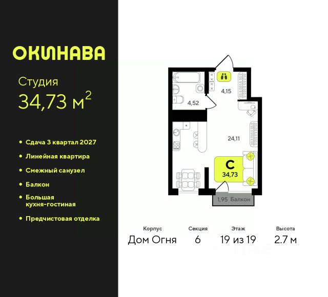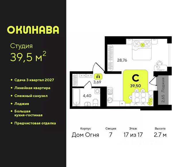 Просторная 1-комн. квартира-студия с предчистовой отделкой в ЖК "Окинава" на 17 этаже. Общая площадь: 39.5 кв.м., площадь гостиной 28.76 кв.м., из которых 5 кв.м. выделено под кухонную зону. Все окна выходят на одну сторону. В квартире одна лоджия, один совмещенный санузел. Высота потолков 2.7 м. Квартира будет сдана с предчистовой отделкой: на полах стяжка под финишное покрытие, стены подготовлены под покраску или оклейку обоями, разведена вся электрика с подготовкой для установки выключателей и освещения. При желании вы можете заказать отделку под ключ, варианты возможных решений представлены в альбоме фотографий. Дом монолитный, многоподъездный, переменной этажности, от 13 до 19 этажей. Квартира находится в 7-й секции высотой 17 этажей в корпусе Дом Огня. На этаже 8 квартир. В подъезде 1 пассажирский и 1 грузовой лифт. Окончание строительства - 3 квартал 2027 года. Оформление сделки по договору долевого участия. ЖК "Окинава" это не просто жилой комплекс, это остров 4 стихий. Они отражаются во внешнем виде фасадов домов, обустройстве дворов и внутреннем оформлении холлов. Каждая из стихий это отдельный дом. Между домами раскинется большой двухуровневый пешеходный бульвар. Первый уровень прогулочный с местами для отдыха, амфитеатром и фонтанами. На втором уровне расположатся площадки для детей, спортивных игр и тренировок. Квартал будет располагать богатой инфраструктурой: на первых этажах разместятся магазины, пекарни, кофейни, пункты выдачи, аптеки, детские центры, цветочные салоны и многое другое, что сделает жизнь поистине комфортной. В жилом комплексе есть кладовые, а также несколько видов паркинга: уличный гостевой, закрытый теплый и паркинг в стилобате, попасть в который можно на лифте с любого жилого этажа. Дворы в каждом доме отражают его стихию, отличаясь по наполнению. Они дополняют друг друга, образуя единое дворовое пространство жилого комплекса. Закрытая территория, свободная от автомобилей, обеспечит безопасность и спокойный отдых. Холлы оформлены керамогранитом, зеркалами и разноуровневым освещением. Витражные входные группы, мягкие зоны ожидания, видеонаблюдение 24/7, вместительные колясочные и даже лапомойки для питомцев всё это будет в ЖК "Окинава". Жилой комплекс "Окинава" находится в активно развивающемся V заречном микрорайоне, недалеко от озера Алебашево, где в будущем расположится масштабный ивент-парк с зонами отдыха. Удобная транспортная развязка позволит добраться до центра всего за 15 минут. #zwEl9v