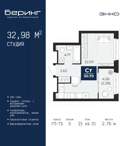 Спешите оформить бронирование, пока действует скидка, предложение ограничено! Стоимость квартиры указана со скидкой, ваша экономия составит 609,510 руб. Информация по телефону, мы вам все подробно расскажем. 1-комн. квартира-студия от застройщика с предчистовой отделкой в ЖК "Беринг" на 16 этаже. Общая площадь: 36.1 кв.м., площадь гостиной 25.22 кв.м., из которых 10 кв.м. выделено под кухонную зону. Все окна выходят на одну сторону. В квартире одна лоджия, один совмещенный санузел. Высота потолков 2.75 м. Дом монолитный, многоподъездный, переменной этажности, от 9 до 22 этажей. Квартира находится в 3-й секции высотой 16 этажей в корпусе ГП-73. На этаже 8 квартир. В подъезде 1 пассажирский и 1 грузовой лифт. Строительство завершено, дом сдан в 1 квартале 2026 года. Оформление сделки по договору купли-продажи. Подобно знаменитому исследователю, мы чувствуем себя первооткрывателями этой локации. Хотим показать новую суть места, сформировать для вас жизненный опыт, которого ещё не было. Беринг — район зелёного цвета. Беринг — район, который откроется вам с другой стороны. Впечатлит новым уровнем комфорта и качеством жизни. Беринг — открытие на карте города. Первый квартал расположен в районе Тура, в границах улиц: Камчатская Западносибирская Энтузиастов. Вокруг уже есть всё для того, чтобы ежедневная рутина была лишь частью жизни и не доставляла дискомфорта. Школы и детские сады, магазины и аптеки, поликлиника, места для семейного отдыха, пеших и велопрогулок, и даже рыбалки. Масштабное озеленение дворов — визитная карточка ЭНКО и ваш оазис спокойствия, чтобы отвлечься от повседневности. Раскидистые деревья, кустарники, травы и цветы — осталось остановиться, вдохнуть и расслабиться, глядя на эту природную красоту. Стилистика подъездов продолжает концепцию Беринга, вдохновлённого Камчаткой: сдержанный, но при этом впечатляющий дизайн соседствует с удобством и функциональностью. #2MddF1