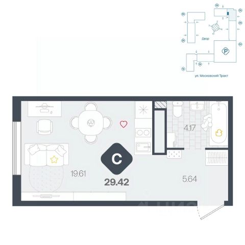 Просторная однокомнатная квартира-студия с предчистовой отделкой в ЖК "Прео" на 24 этаже. Общая площадь: 25.61 кв.м., площадь гостиной 16.58 кв.м., из которых 5 кв.м. выделено под кухонную зону. Все окна выходят на одну сторону. В квартире один совмещенный санузел. Высота потолков 2.7 м.